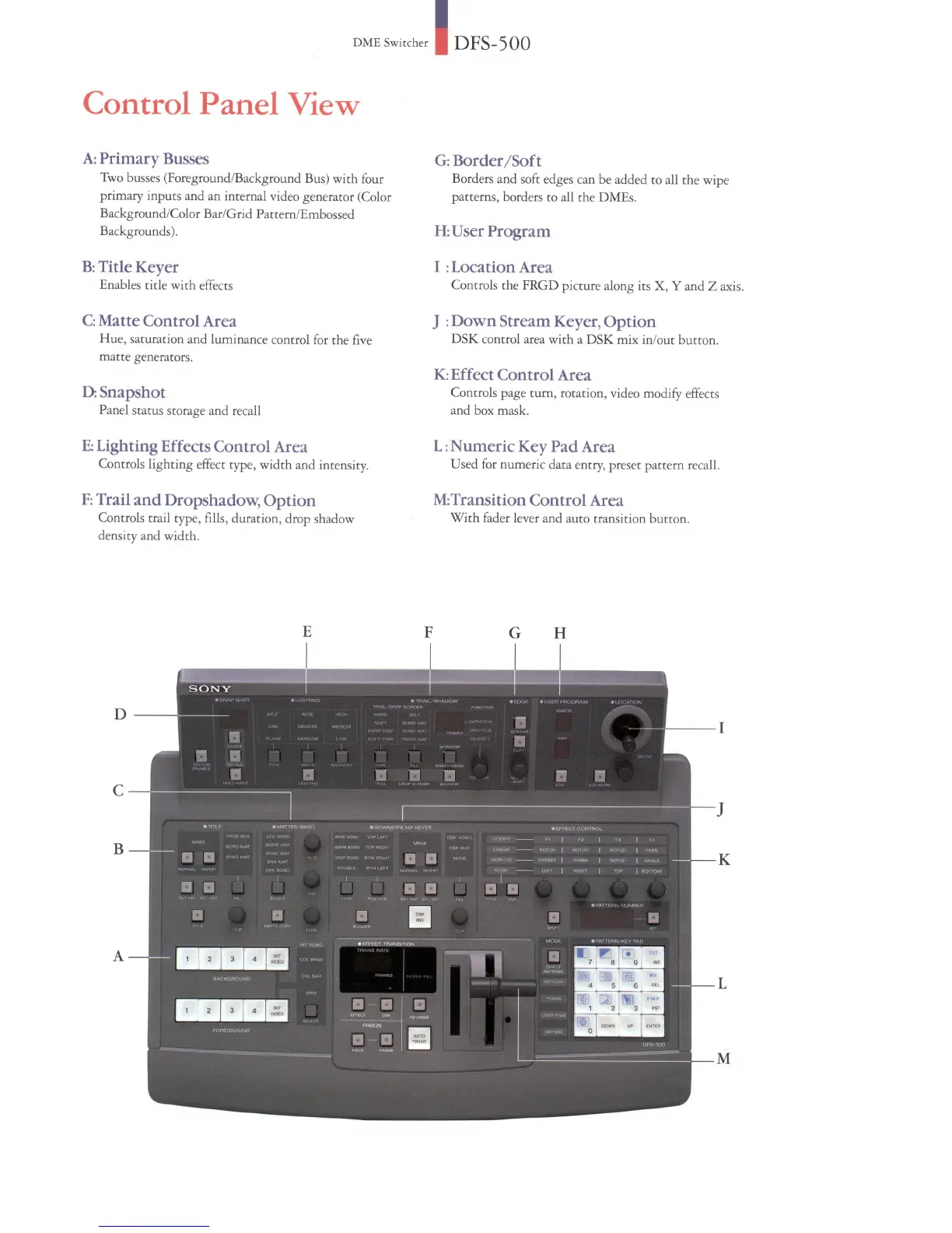 Sony DFS-500 - Control Panel View; Primary Busses and Input Controls (A); Lighting, Trail, and Shadow Controls (E, F)