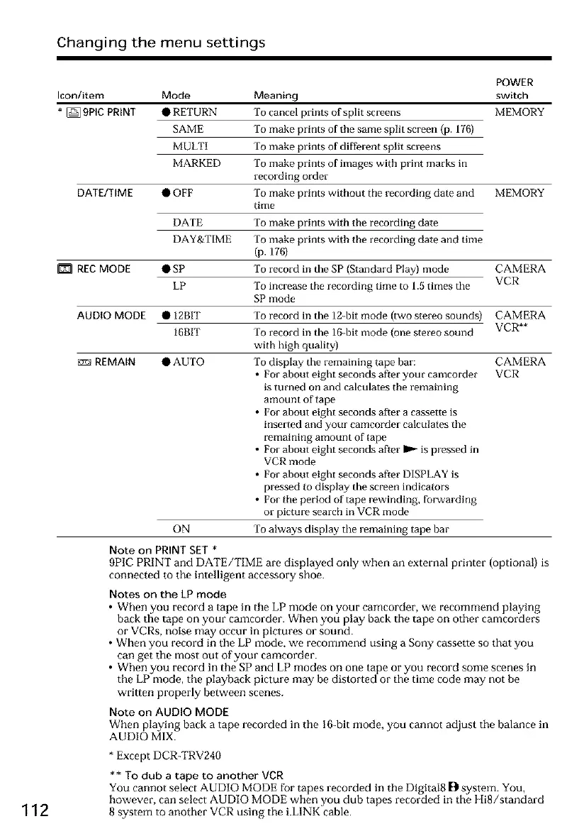 • When you record a tape in the LP mode on your camcorder, we recommend playing