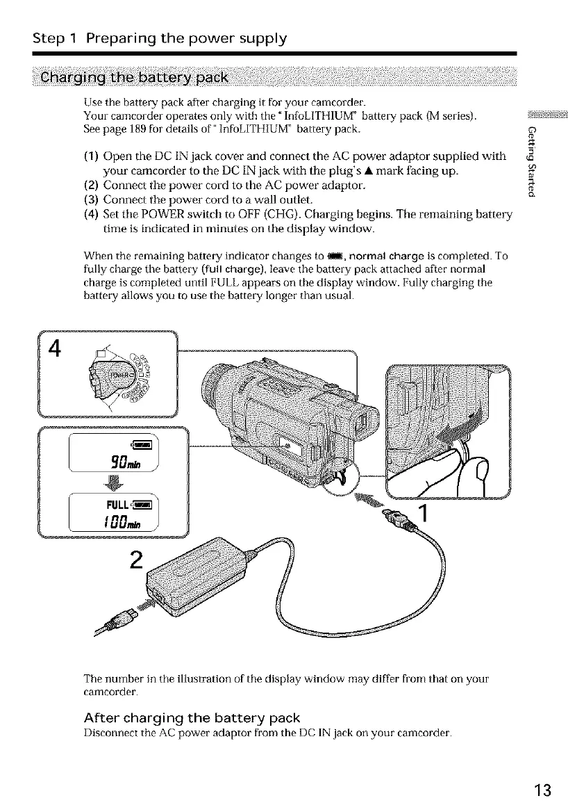 (4) Set tile POWER switch m OFF (CHG). Charging begins. The remaining battery