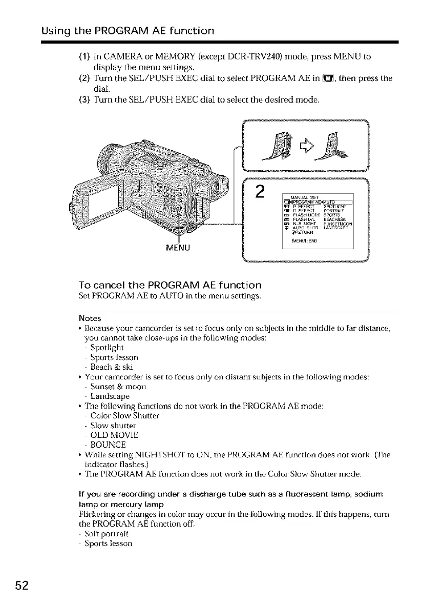 • The following functions do not work in the PROGRAM AE mode: