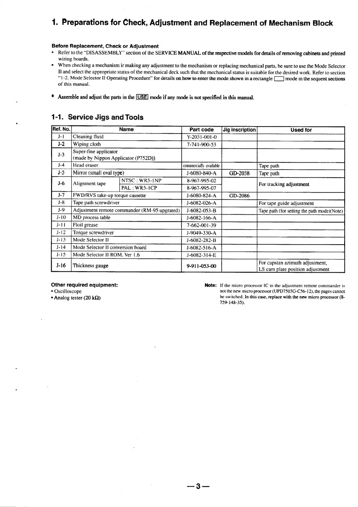 Sony Digital8 M2000 - Preparations for Check, Adjustment and Replacement of Mechanism Ae; Service Jigs and Tools