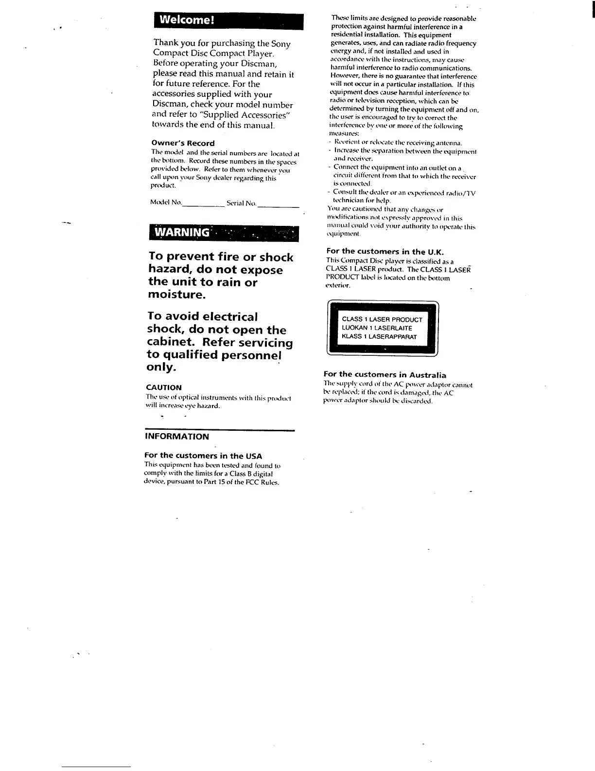 Sony Discman D-240 - Product Information and Safety; Owners Record; General Safety Warnings; Regulatory Compliance