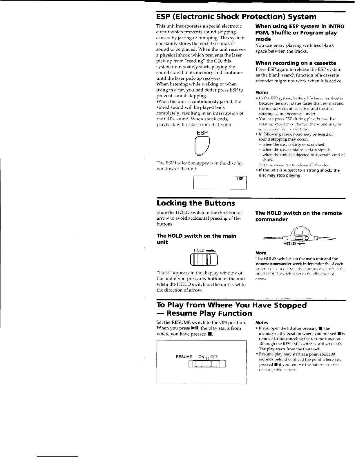 Sony Discman D232 - ESP System; Locking the Buttons; To Play from Where You Have Stopped - Resume Play Function