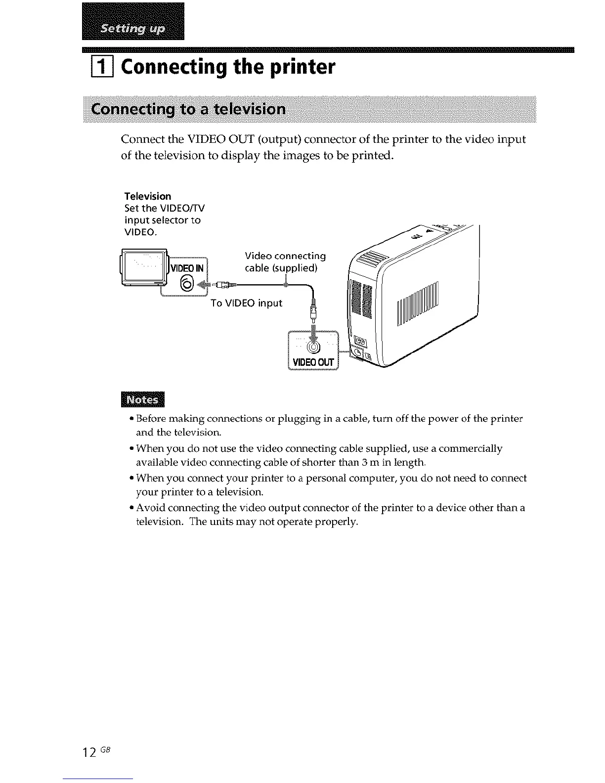 • Avoid connecting the video output col_nector of the printer to a device other than a