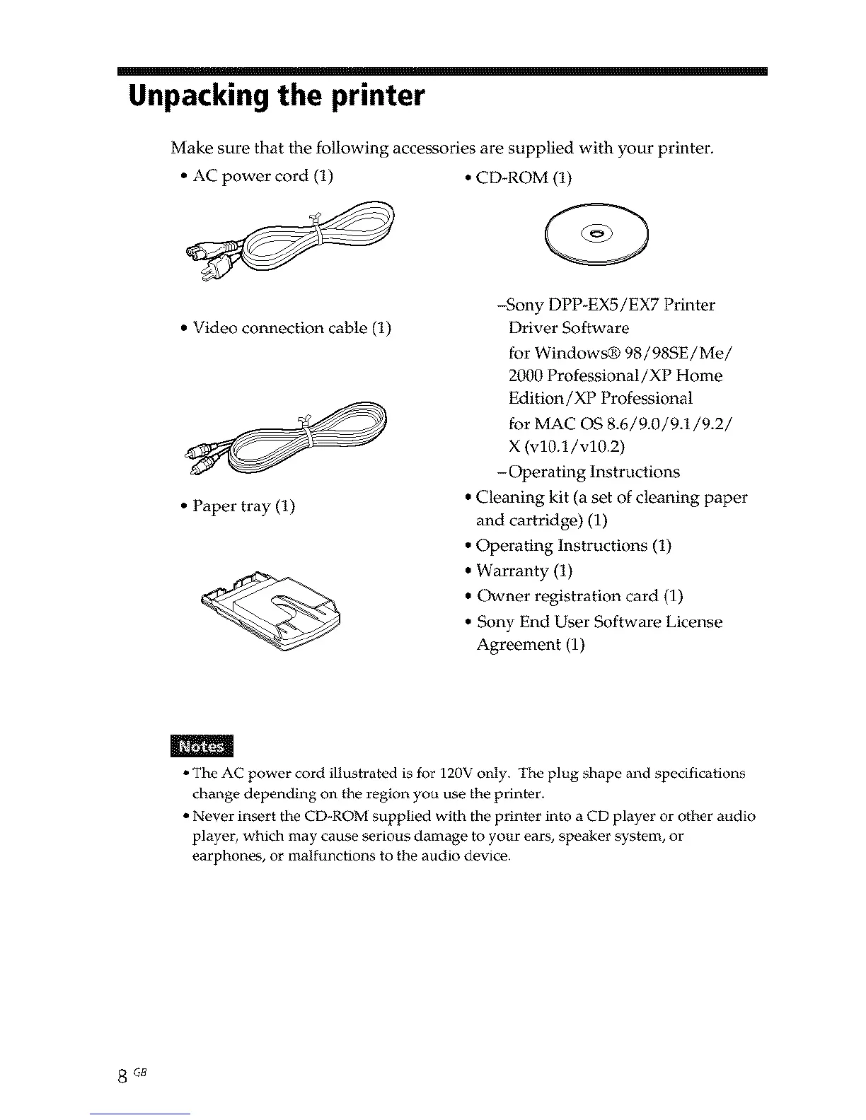 • The AC power cord illustrated is for 120V only. The plug shape and specifications