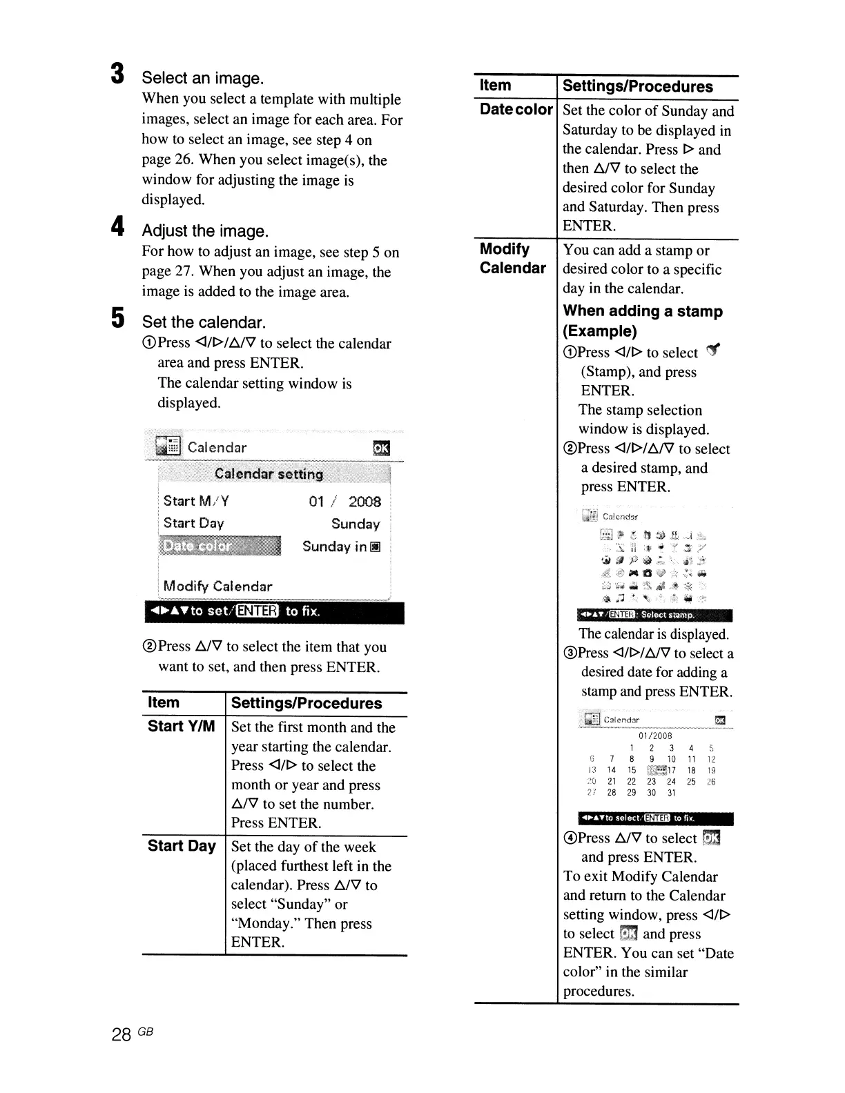 calendar). Press