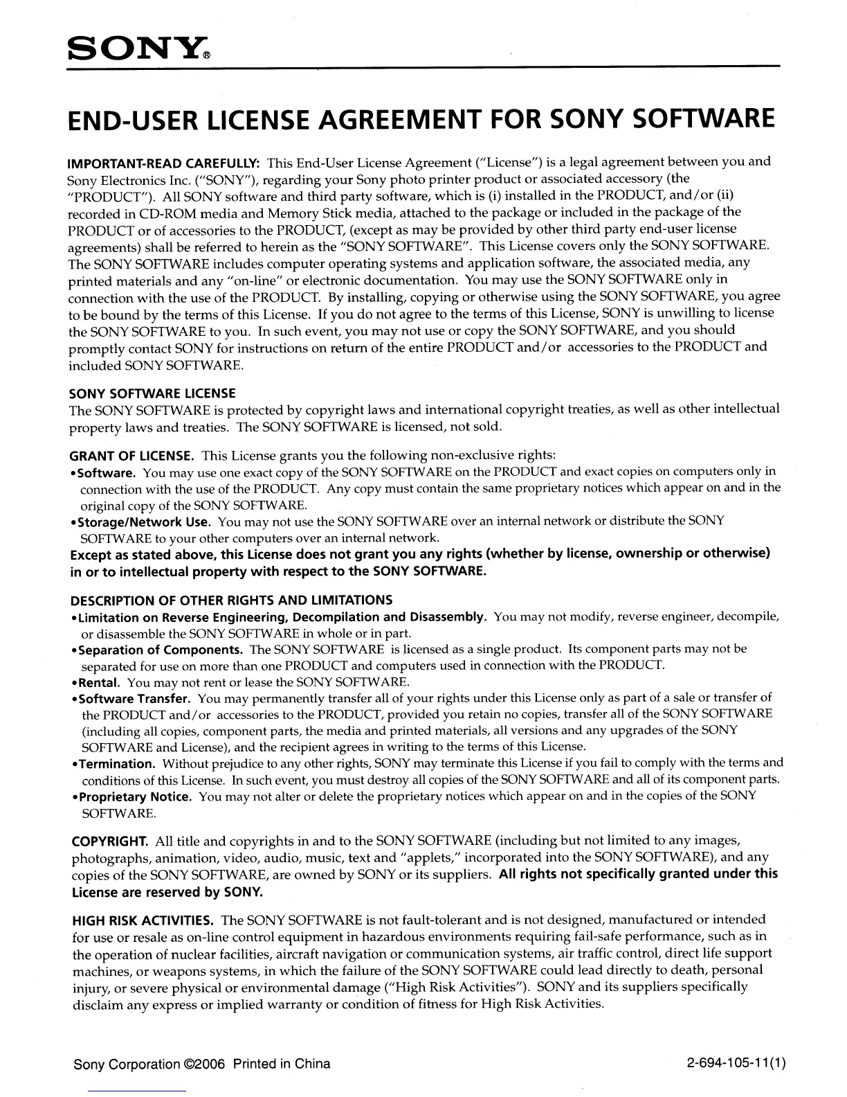 printed materials, all versions and any upgrades of the SONY