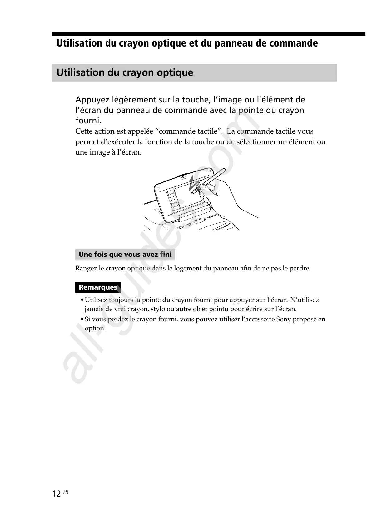 •Si vous perdez le crayon fourni, vous pouvez utiliser l’accessoire Sony proposé en