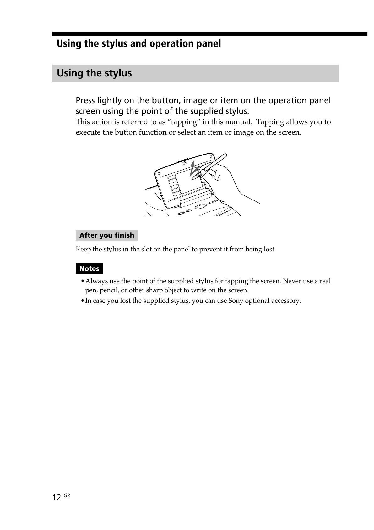 •Always use the point of the supplied stylus for tapping the screen. Never use a real