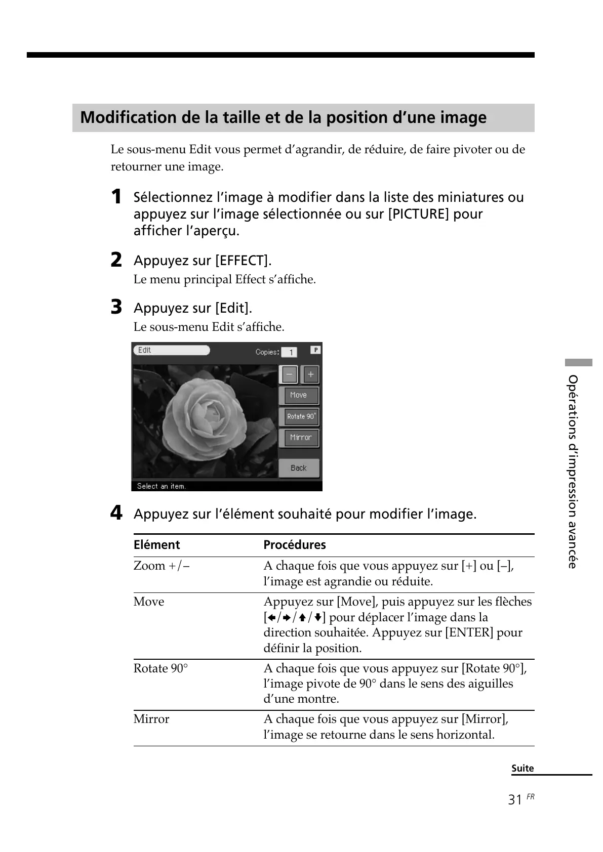 Le sous-menu Edit vous permet d’agrandir, de réduire, de faire pivoter ou de