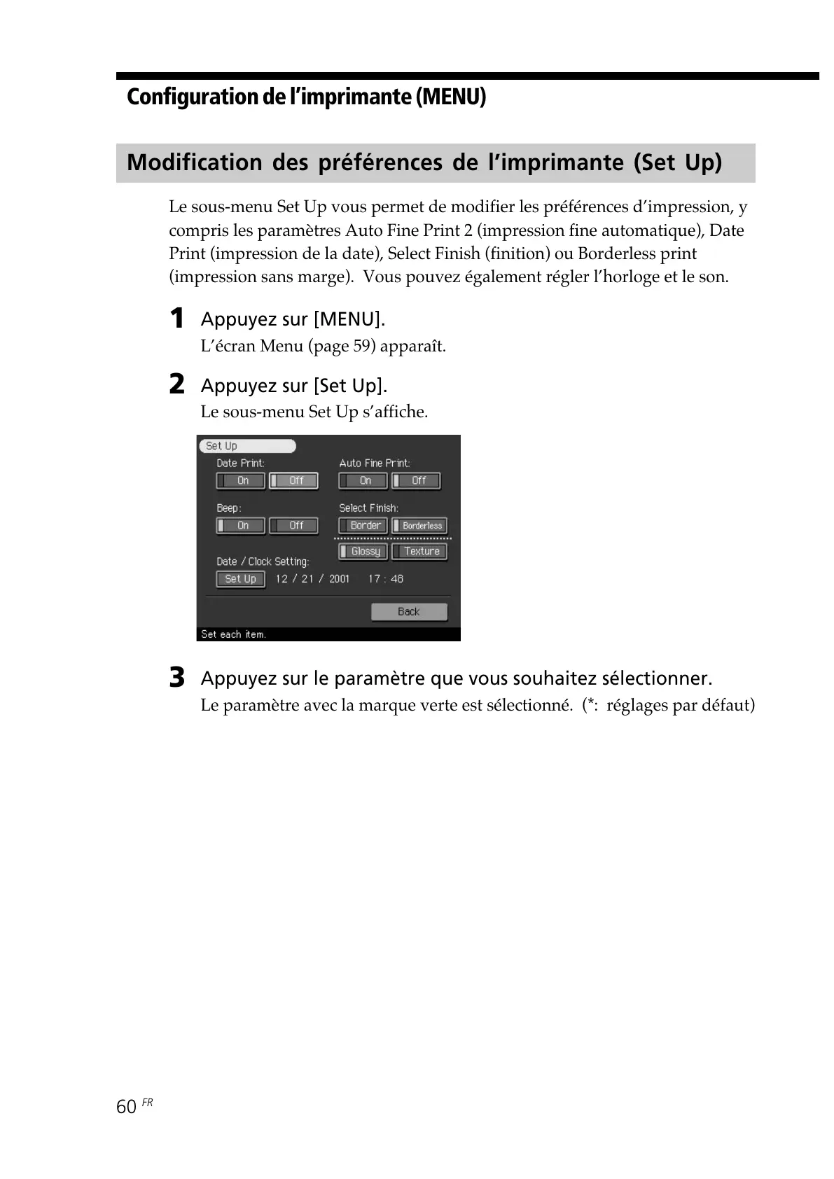 Le sous-menu Set Up vous permet de modifier les préférences d’impression, y