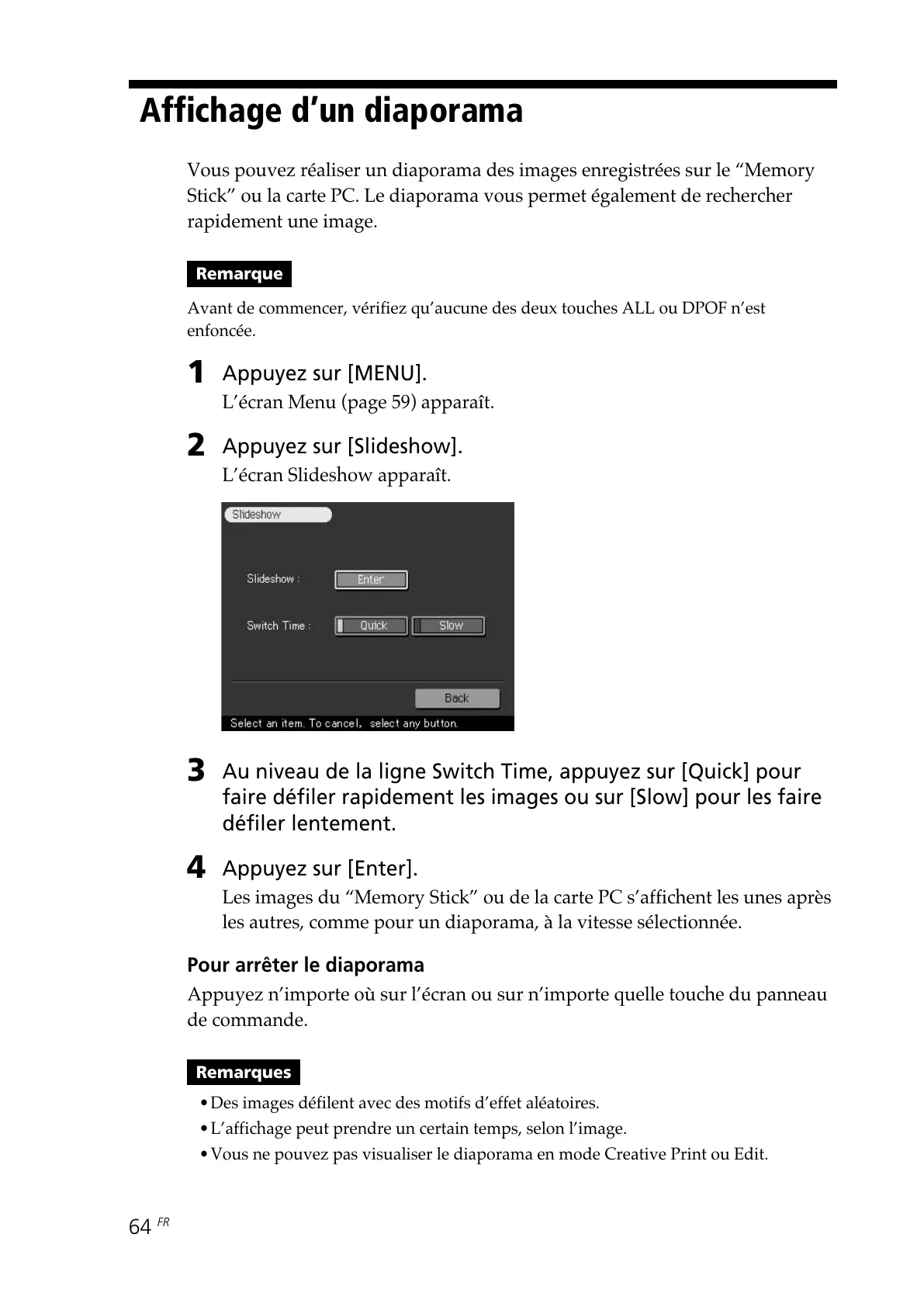 faire défiler rapidement les images ou sur [Slow] pour les faire