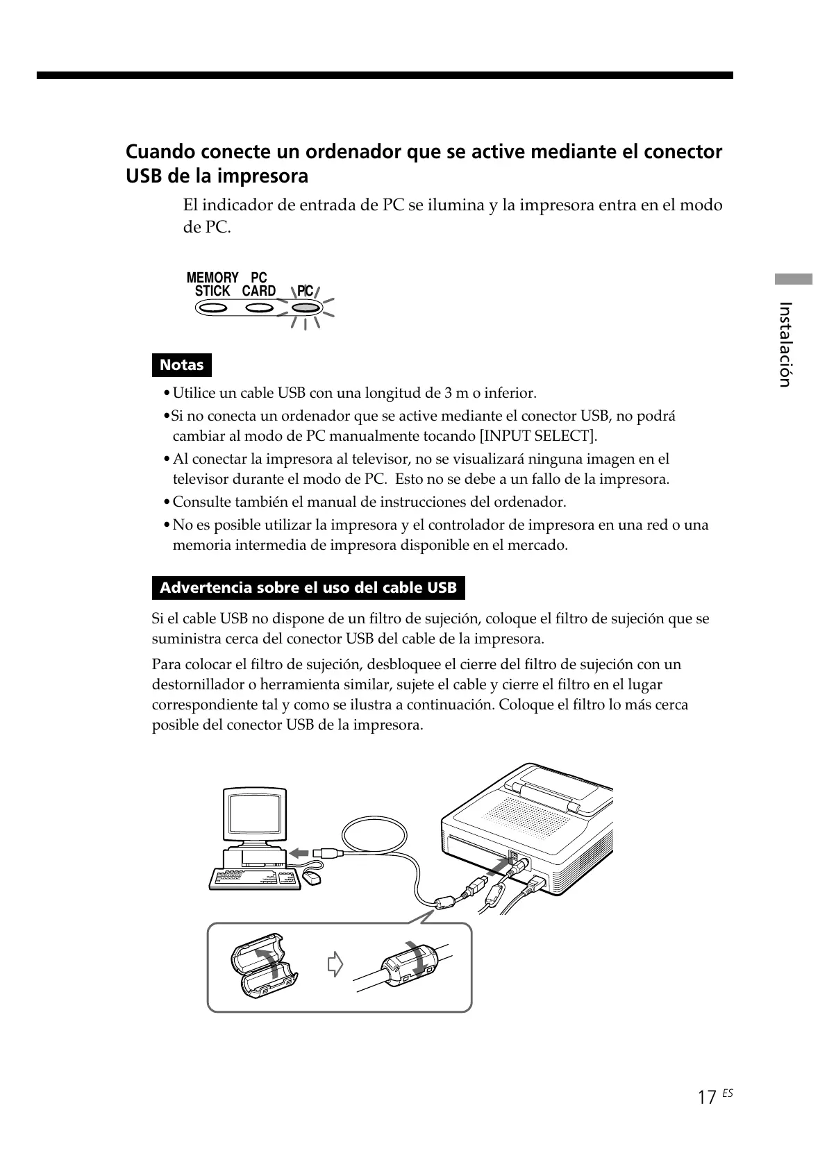 Si el cable USB no dispone de un filtro de sujeción, coloque el filtro de sujeción que se