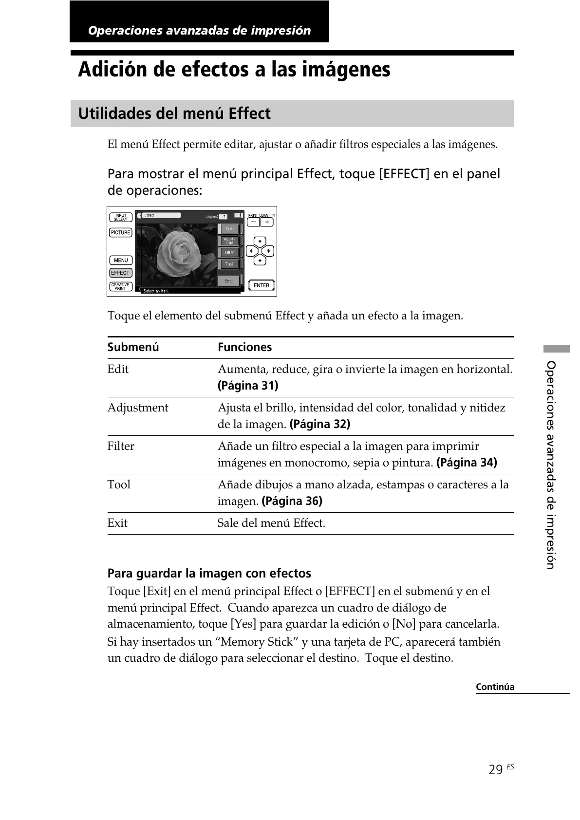 El menú Effect permite editar, ajustar o añadir filtros especiales a las imágenes.