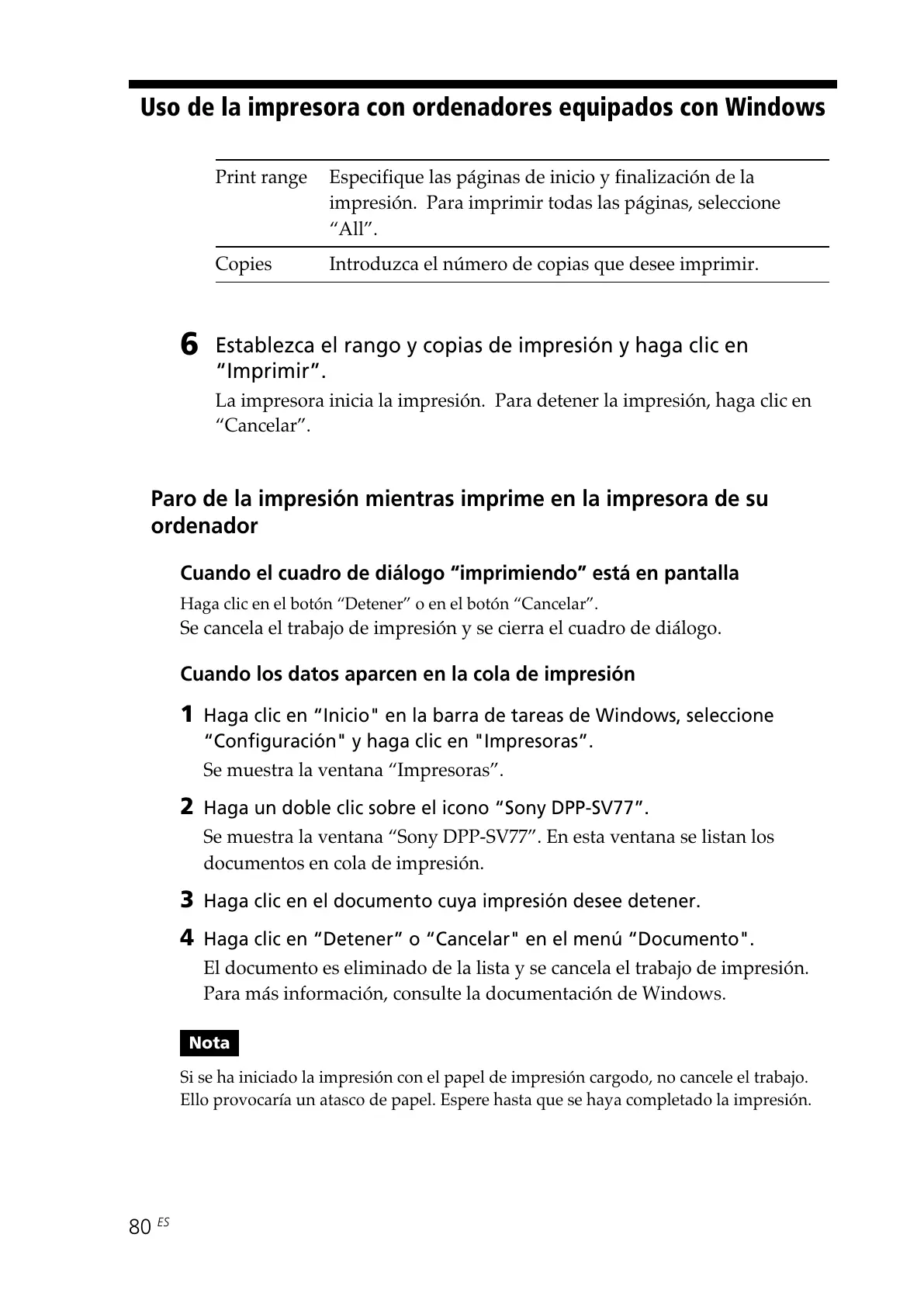 Si se ha iniciado la impresión con el papel de impresión cargodo, no cancele el trabajo.