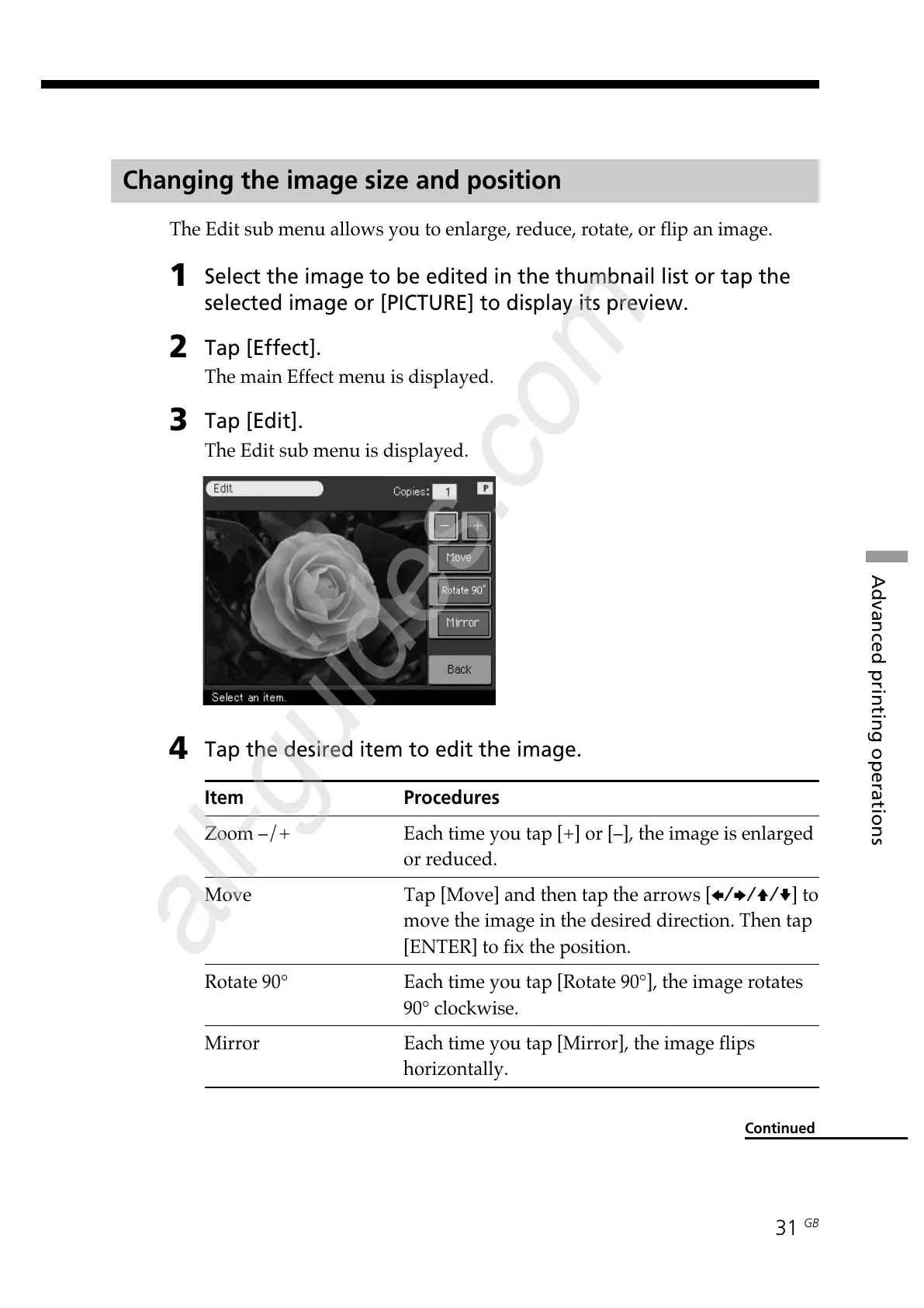 The Edit sub menu allows you to enlarge, reduce, rotate, or flip an image.