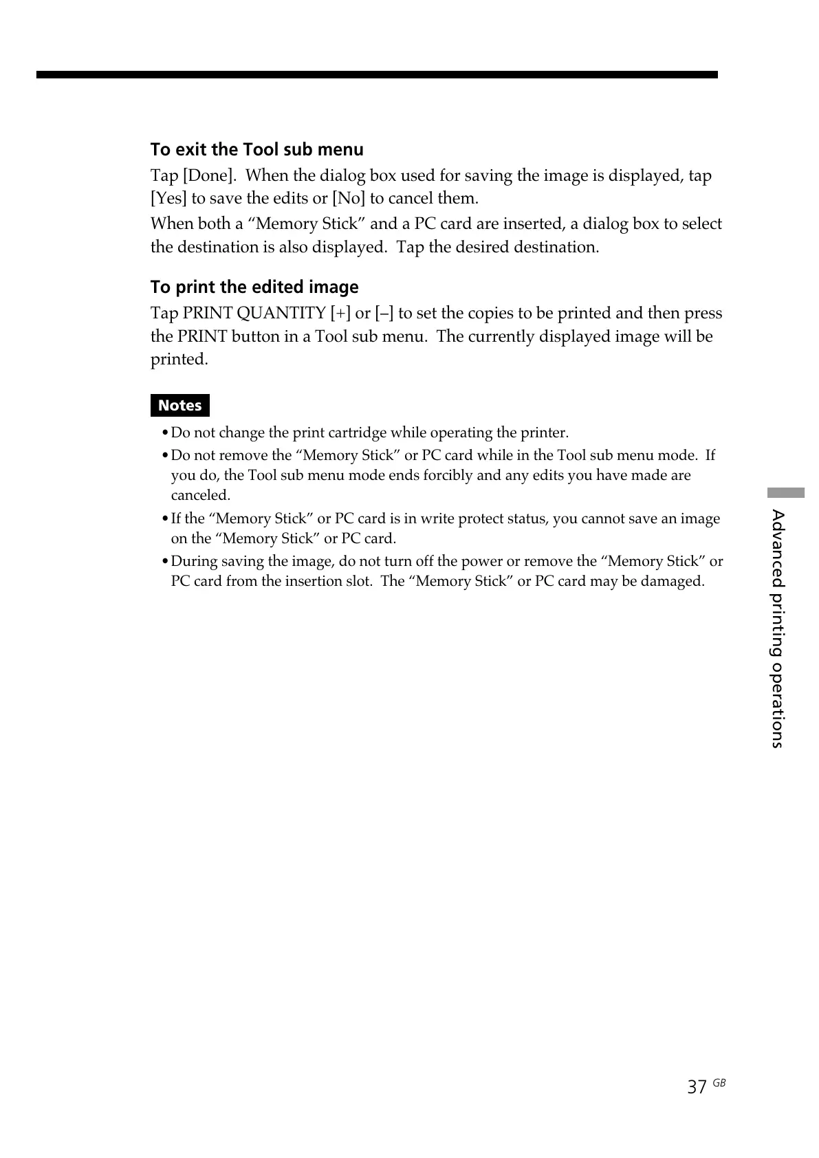•Do not remove the “Memory Stick” or PC card while in the Tool sub menu mode. If