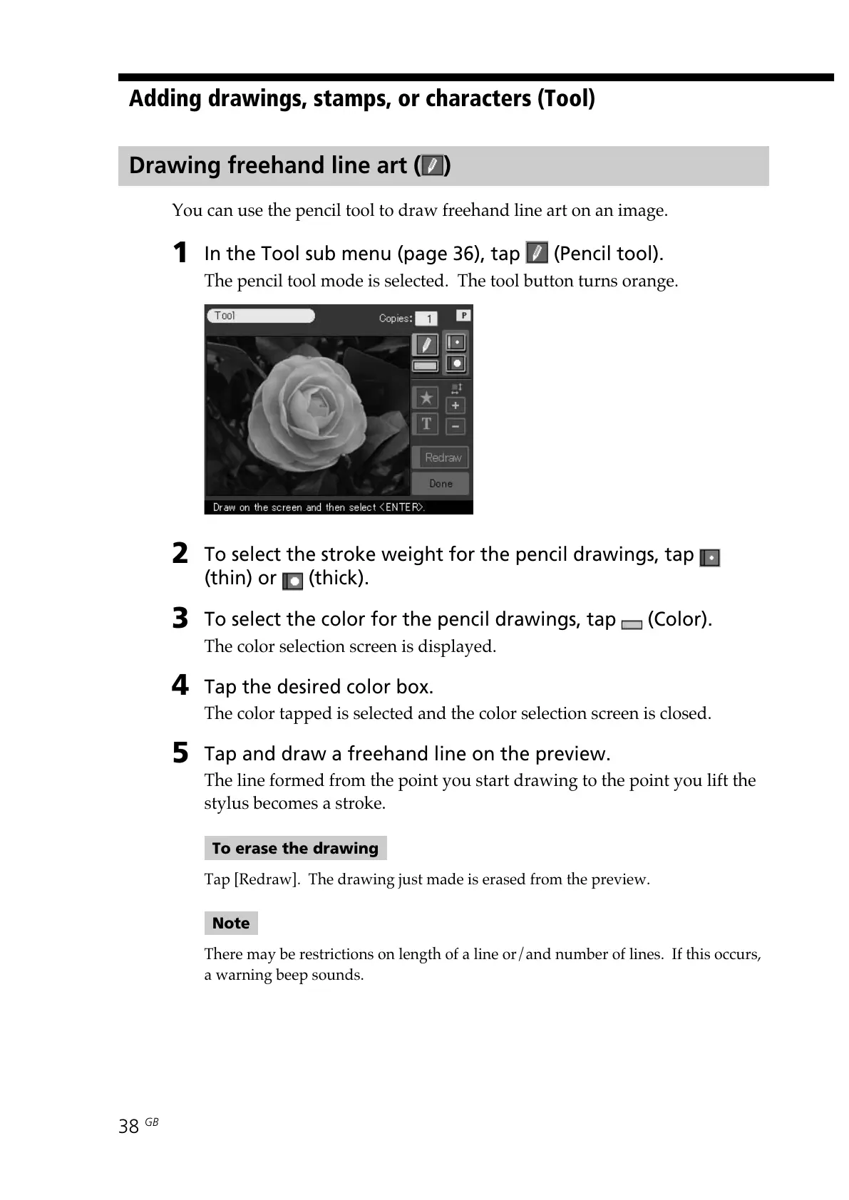 In the Tool sub menu (page 36), tap (Pencil tool).