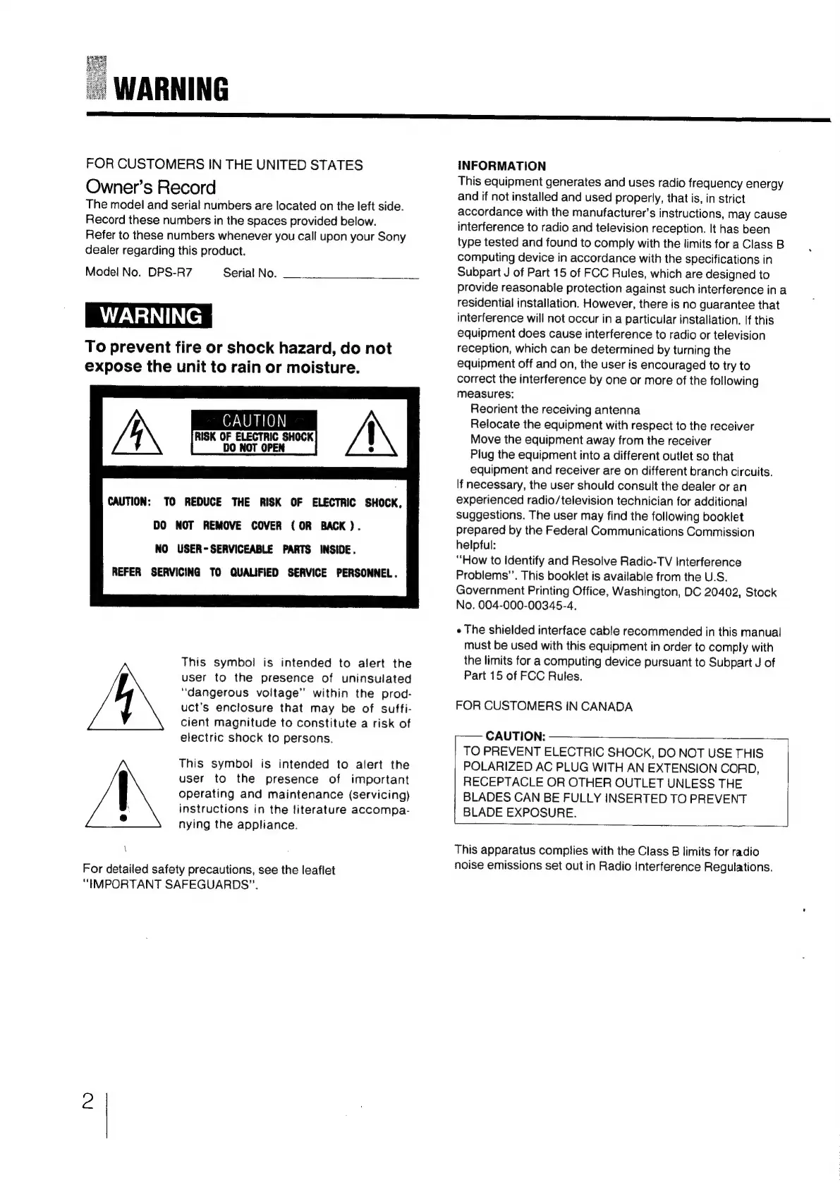 Sony DPS-R7 - Safety Warnings and Compliance; Electric Shock Prevention; FCC Compliance and Interference; Canadian Customer Safety Advice