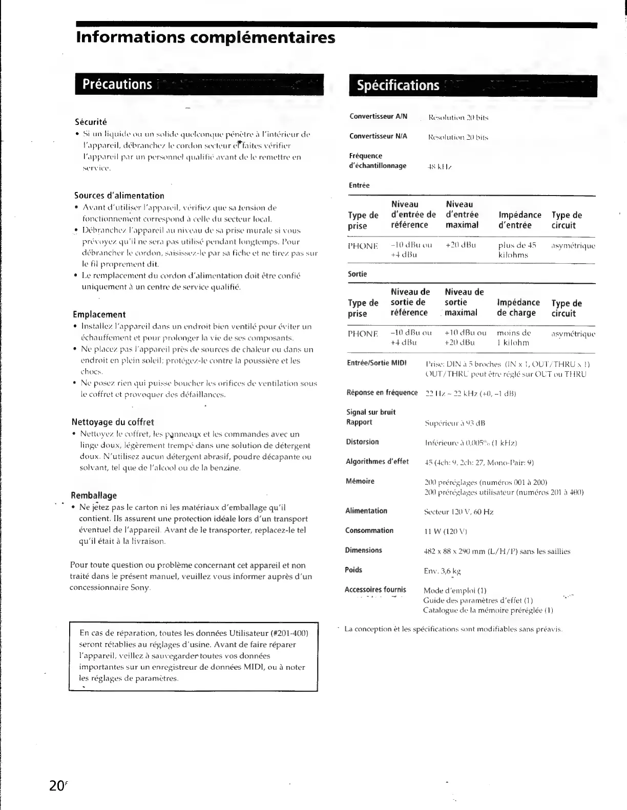 Sony DPS-V55 - Précautions; Spécifications