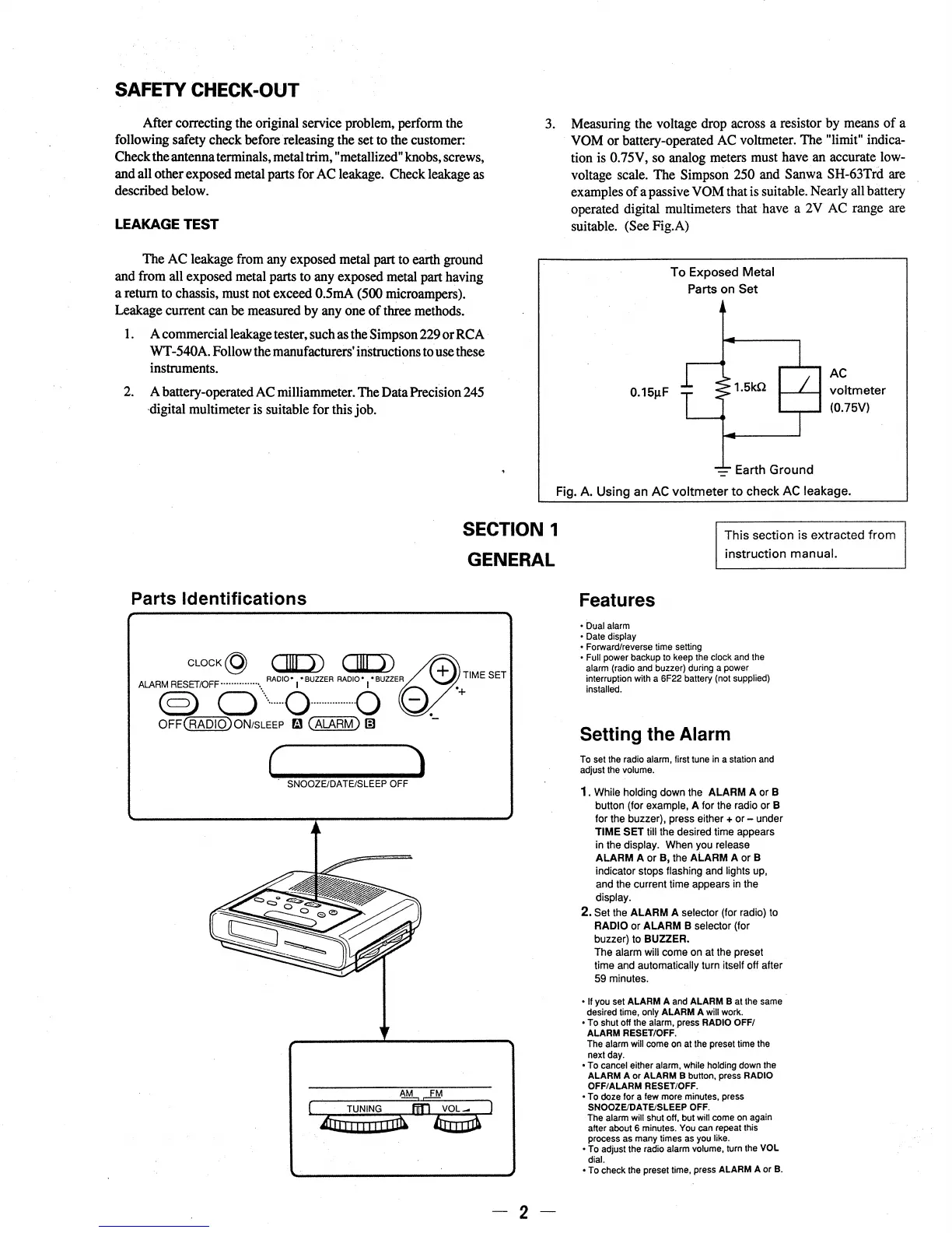 Sony DREAM MACHINE ICF-C430 - Safety Check-Out; Leakage Test; Product View and Parts Identification; Setting the Alarm