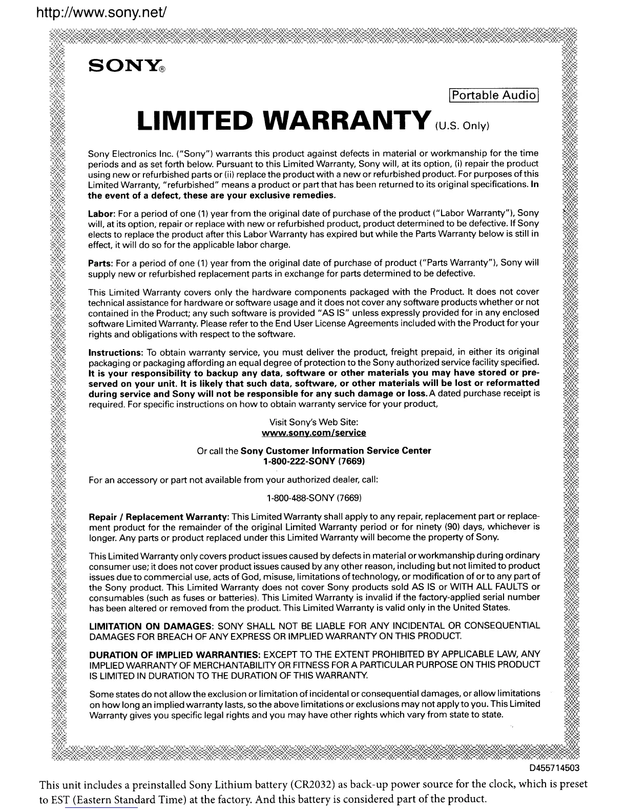 This unit includes a preinstalled Sony Lithium battery (CR2032) as back-up power source for the clock, which