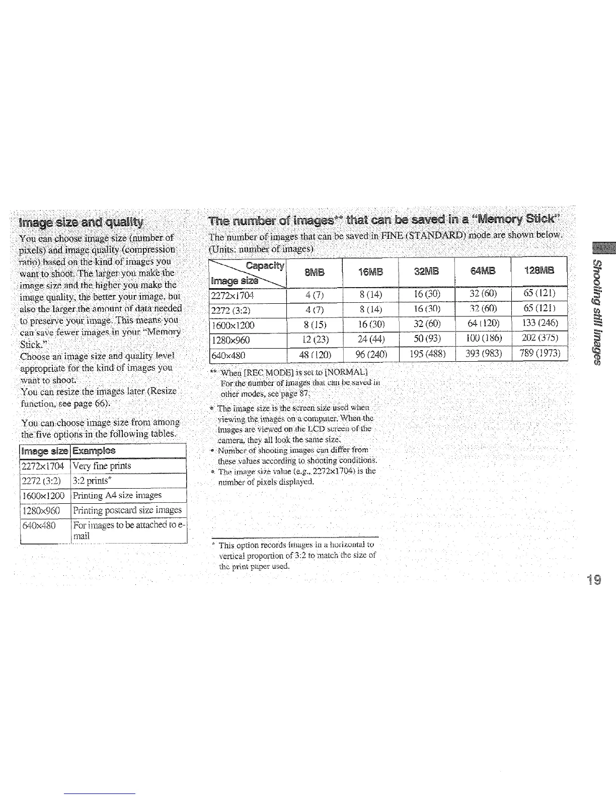 The &mber of images that can be saved in FPG (S~~~~~) mode are shotvn below.