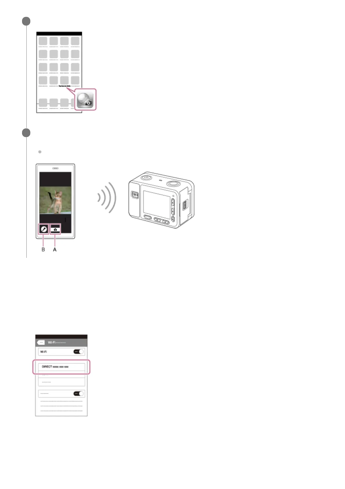 You can set [Self-Timer] or configure the settings to save images to the iPhone or iPad (B).