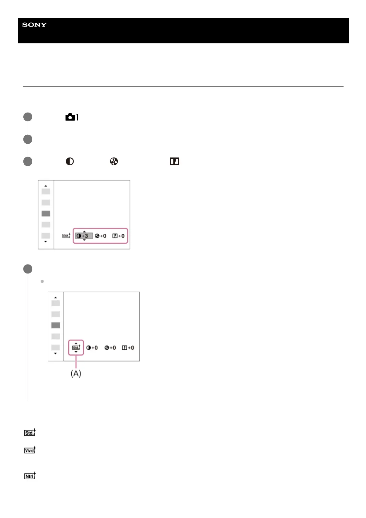 (Contrast), (Saturation) and (Sharpness), select the desired item using the right/left