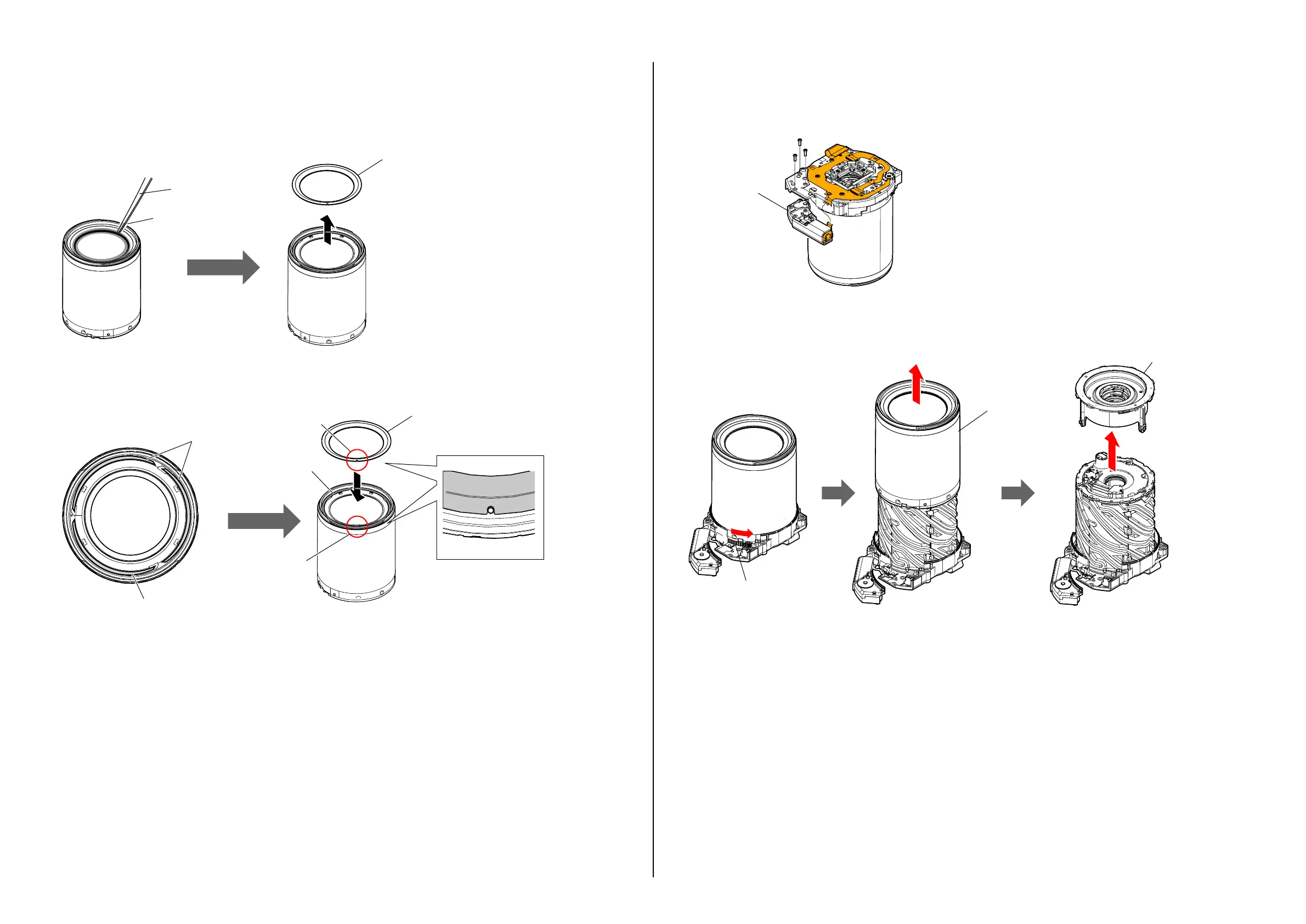 Remove the 1 Group Lens Frame Block Assy and the 2 Group Lens Frame Block Assy.