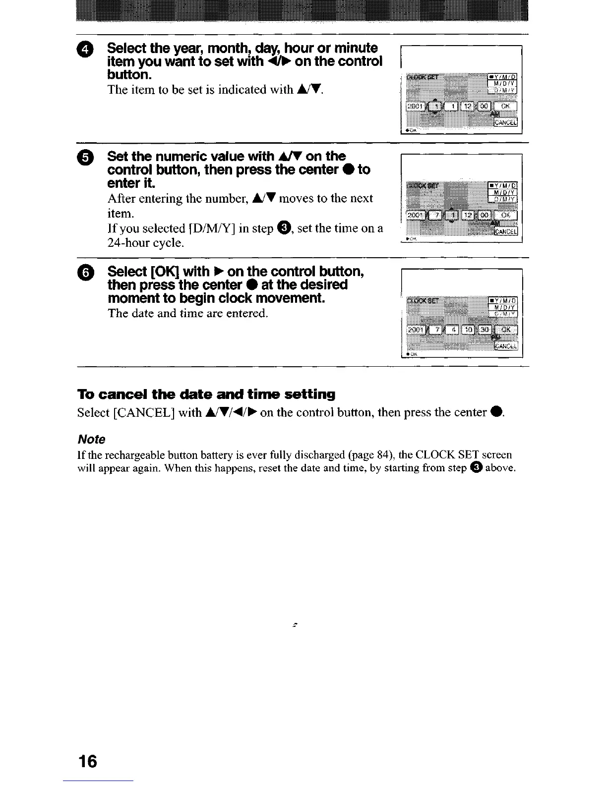 If the rechargeable button battery is ever fully discharged (page 84), the CLOCK SET screen