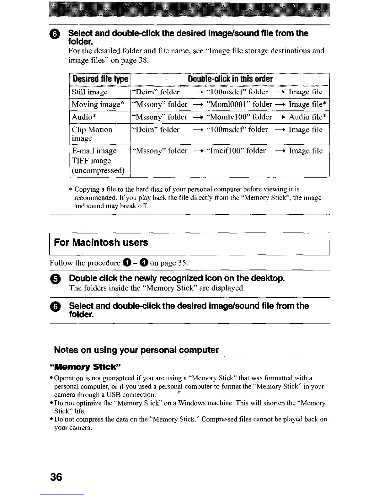 *Do not compress the data on the “Memory Stick.” Compressed files cannot be played back on
