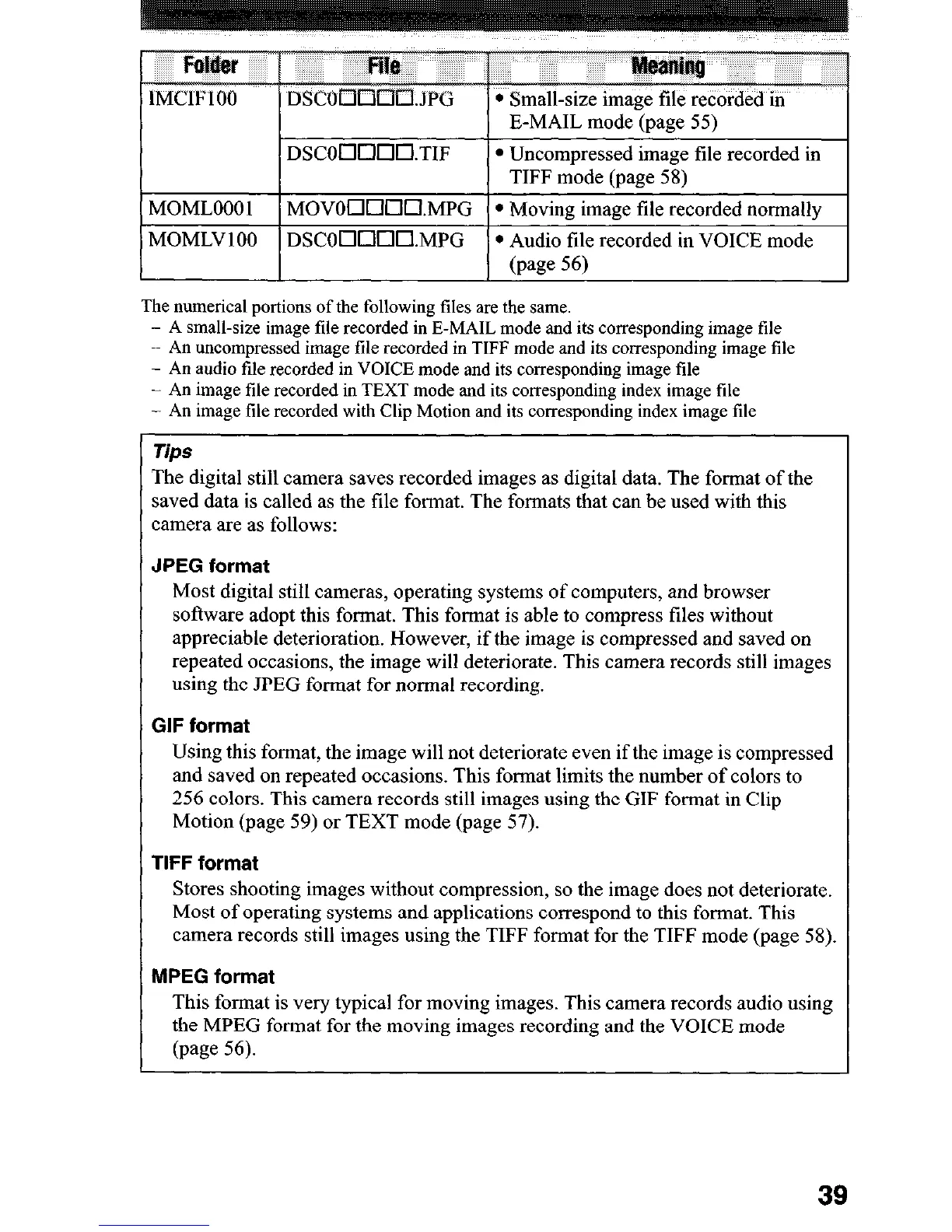 camera records still images using the TIFF format for the TIFF mode (page 58).