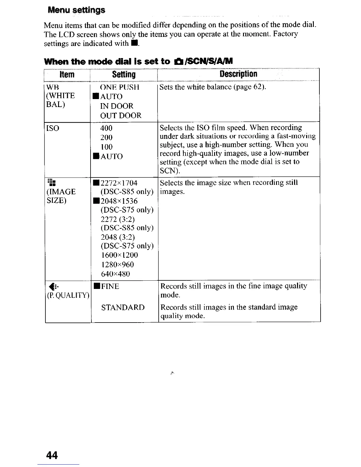 Menu items that can be modified differ depending on the positions of the mode dial.