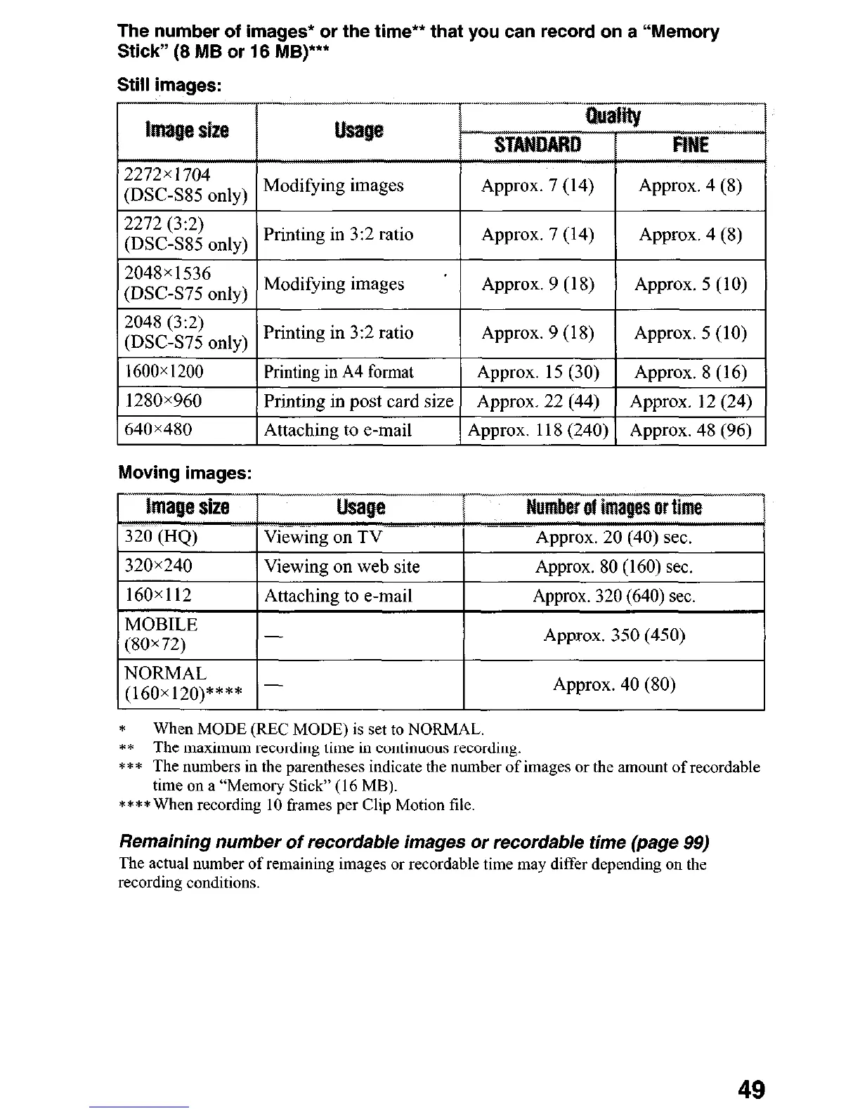 *** The numbers in the parentheses indicate the number of images or the amount of recordable