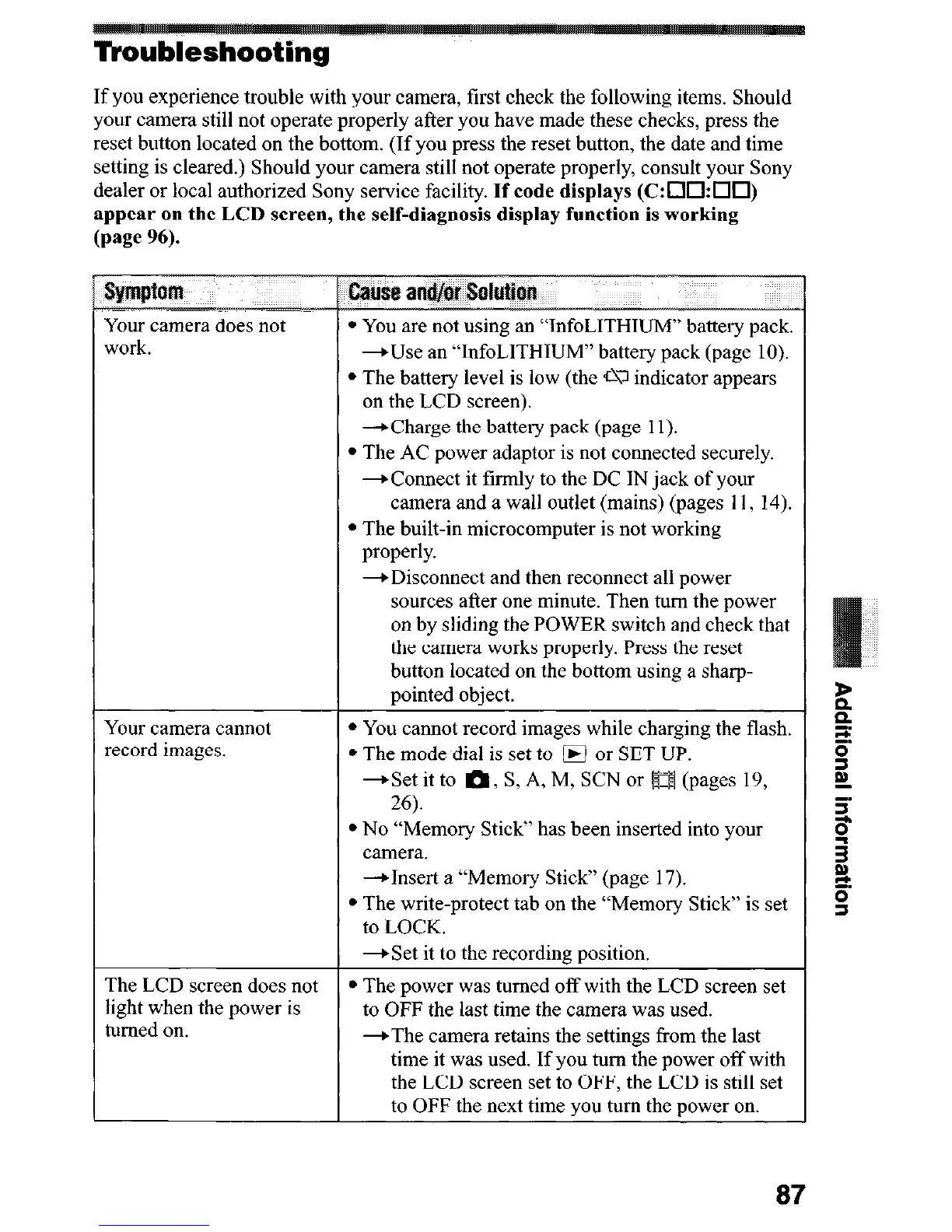 setting is cleared.) Should your camera still not operate properly, consult your Sony