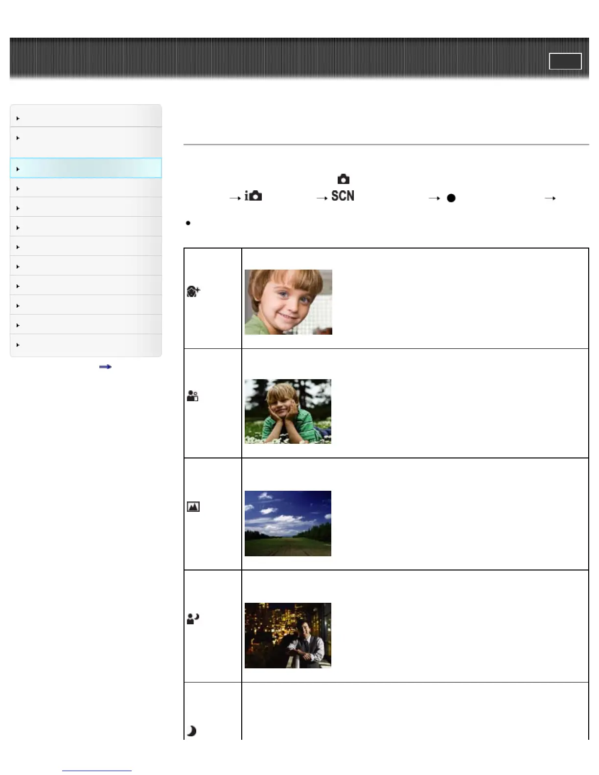 Top page > Shooting > Selecting the shooting mode based on the subject > Scene Selection