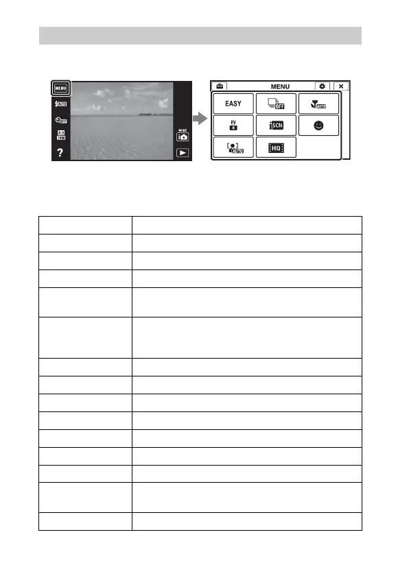 通过轻触屏幕上的MENU可操作拍摄或播放时所用的其他功能。本相机具