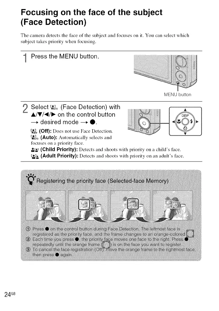 Select E_0(Face Detection) with _,A/T/,_/_ on the control button