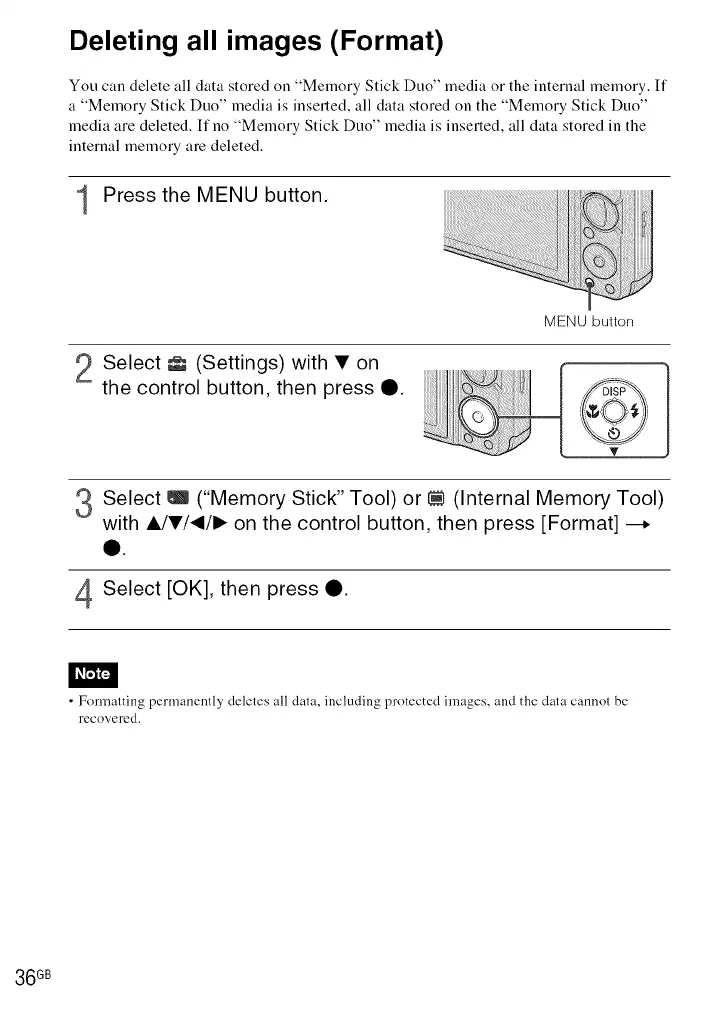 • Formatting permanently deletes all data, including protected images, and the data cannot be