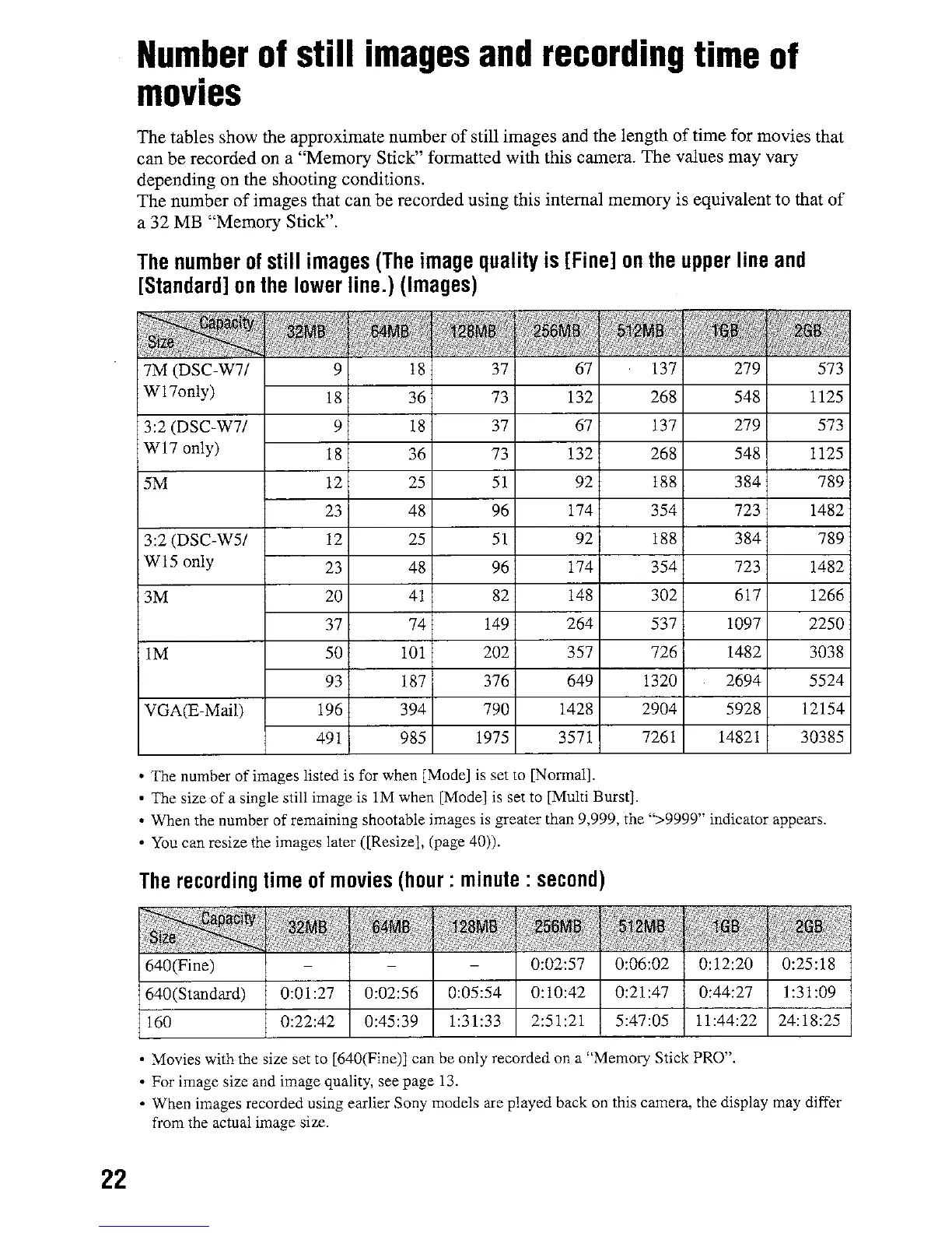 Sony DSC-W5 - Image Storage Capacity; Still Image Storage; Movie Recording Time