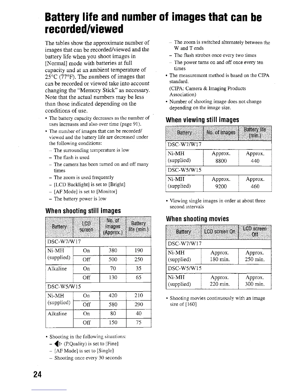 Sony DSC-W5 - Battery Life and Image Count; Still Image Battery Performance; Movie Battery Performance