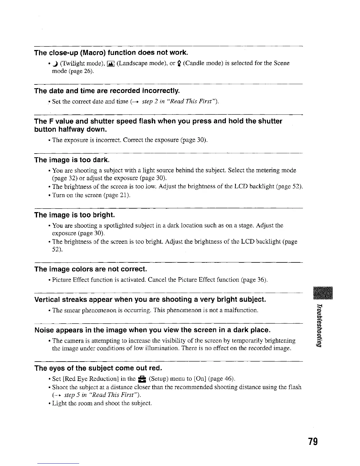Sony DSC-W5 - Advanced Shooting Troubleshooting; Macro Function Issues; Incorrect Date;Time Recording; Shutter Speed;F-Value Errors