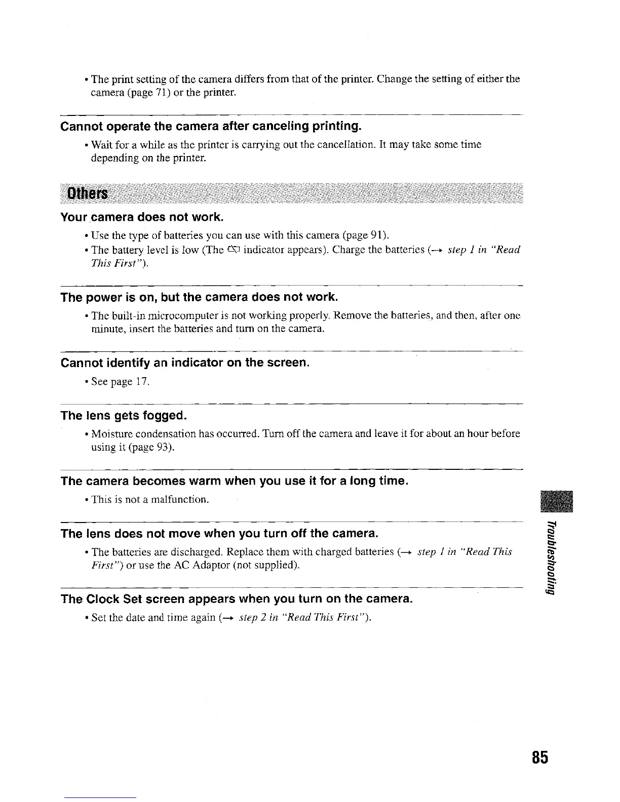 Sony DSC-W5 - General Camera Operation Troubleshooting; Camera Not Operating Correctly; Camera Power On, No Operation; Screen Indicator Identification