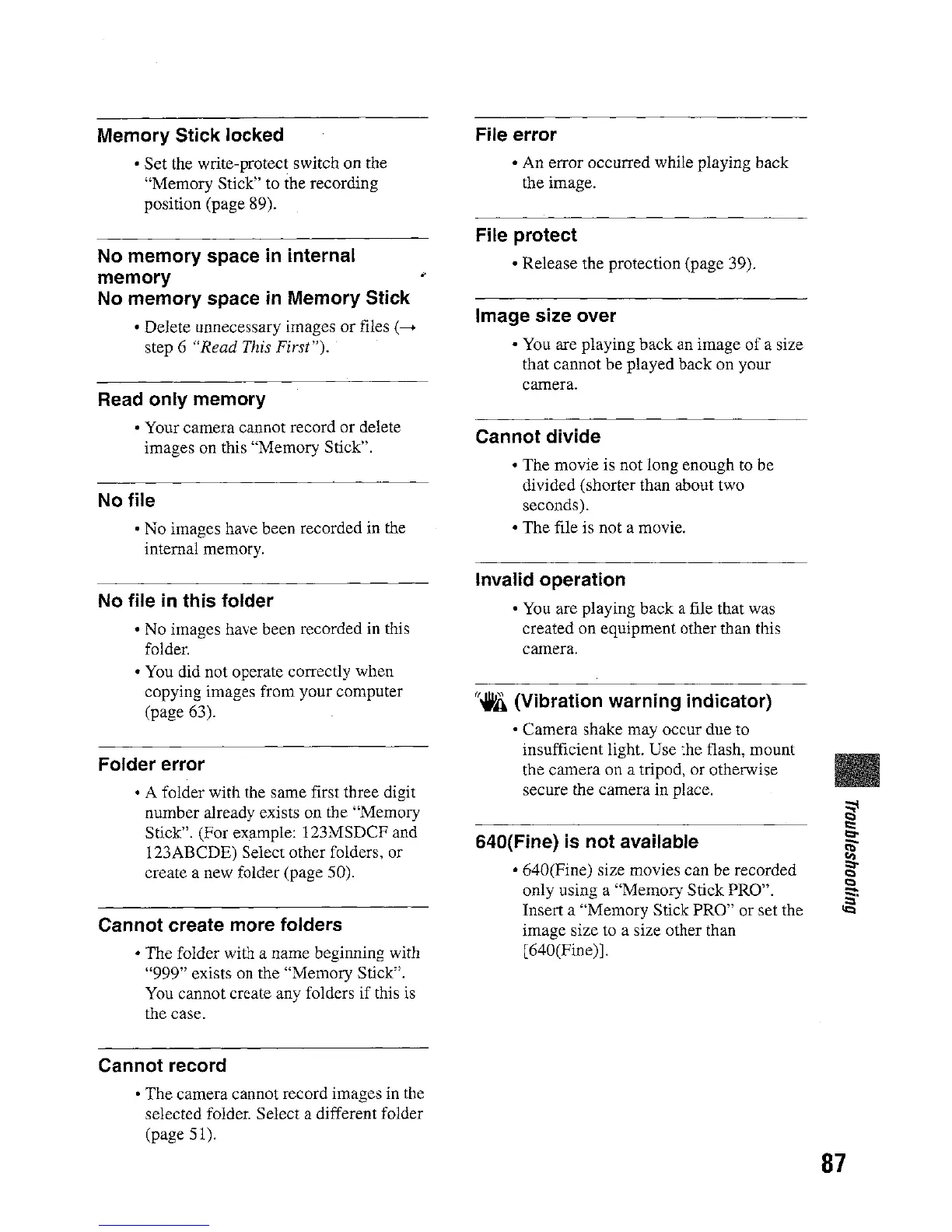 Sony DSC-W5 - Resolving Specific Error Messages; Memory Stick Locked Error; No Memory Space Error; Read-Only Memory Error