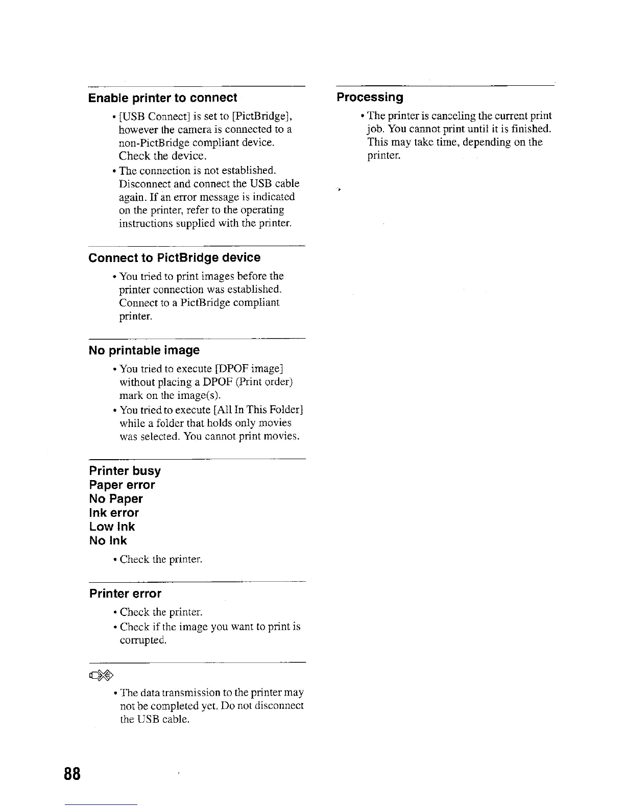 Sony DSC-W5 - Printer Connection and Printing Issues; Printer Connection Troubleshooting; PictBridge Connection Issues; No Printable Image Errors