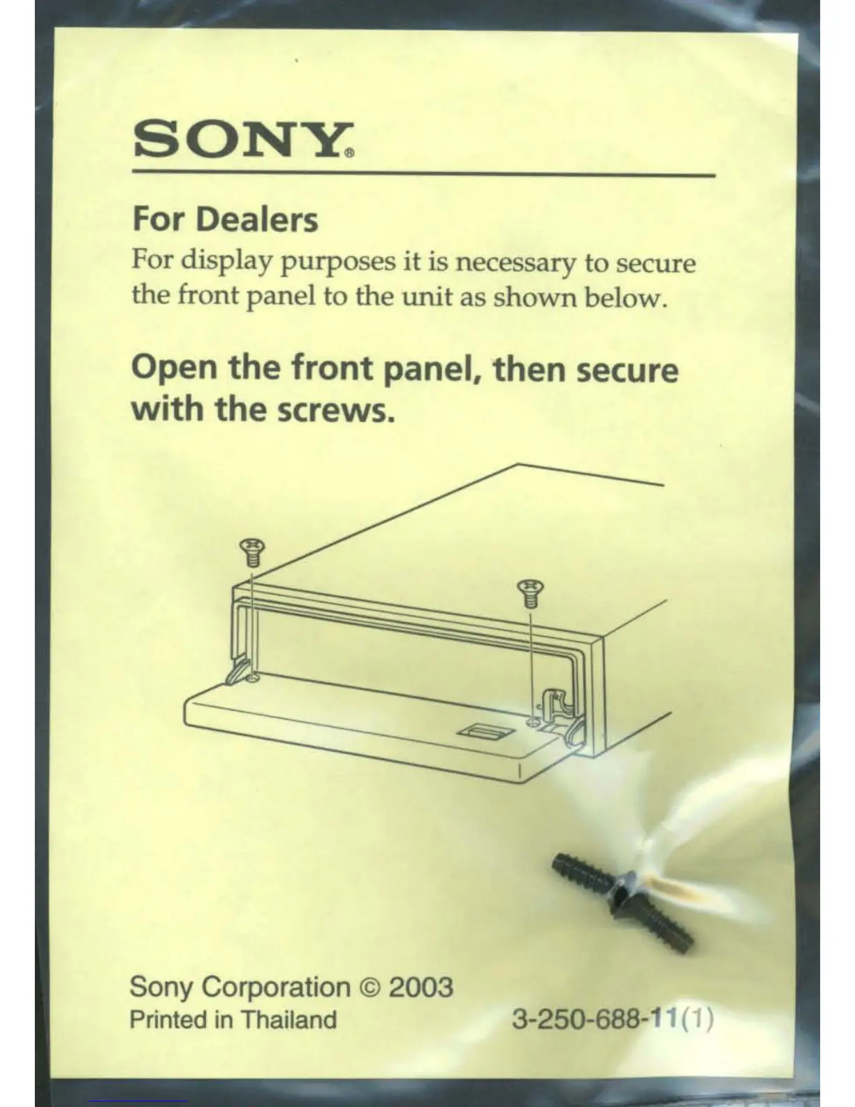 Sony DSX-MS60 - Information for Dealers; Front panel securing for display