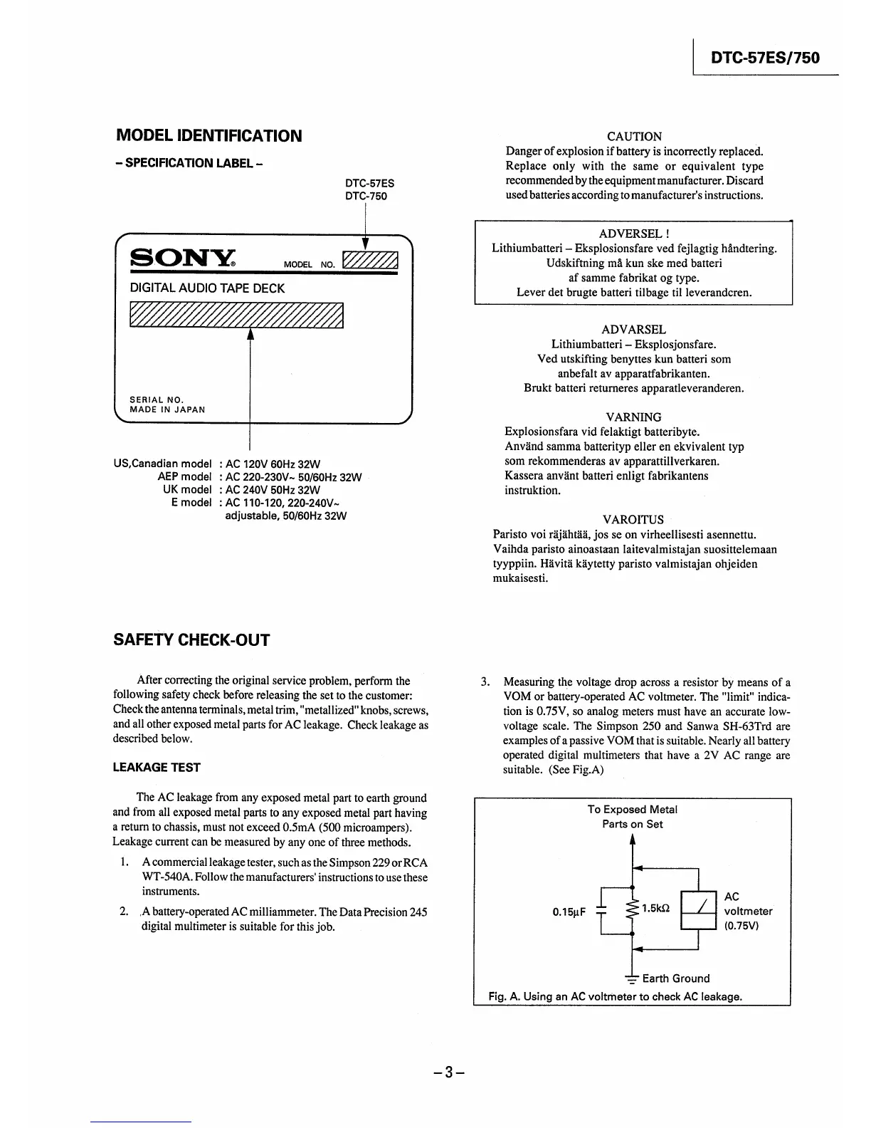Sony DTC-57ES - Safety Checks and Procedures; Safety Check-out and Leakage Test