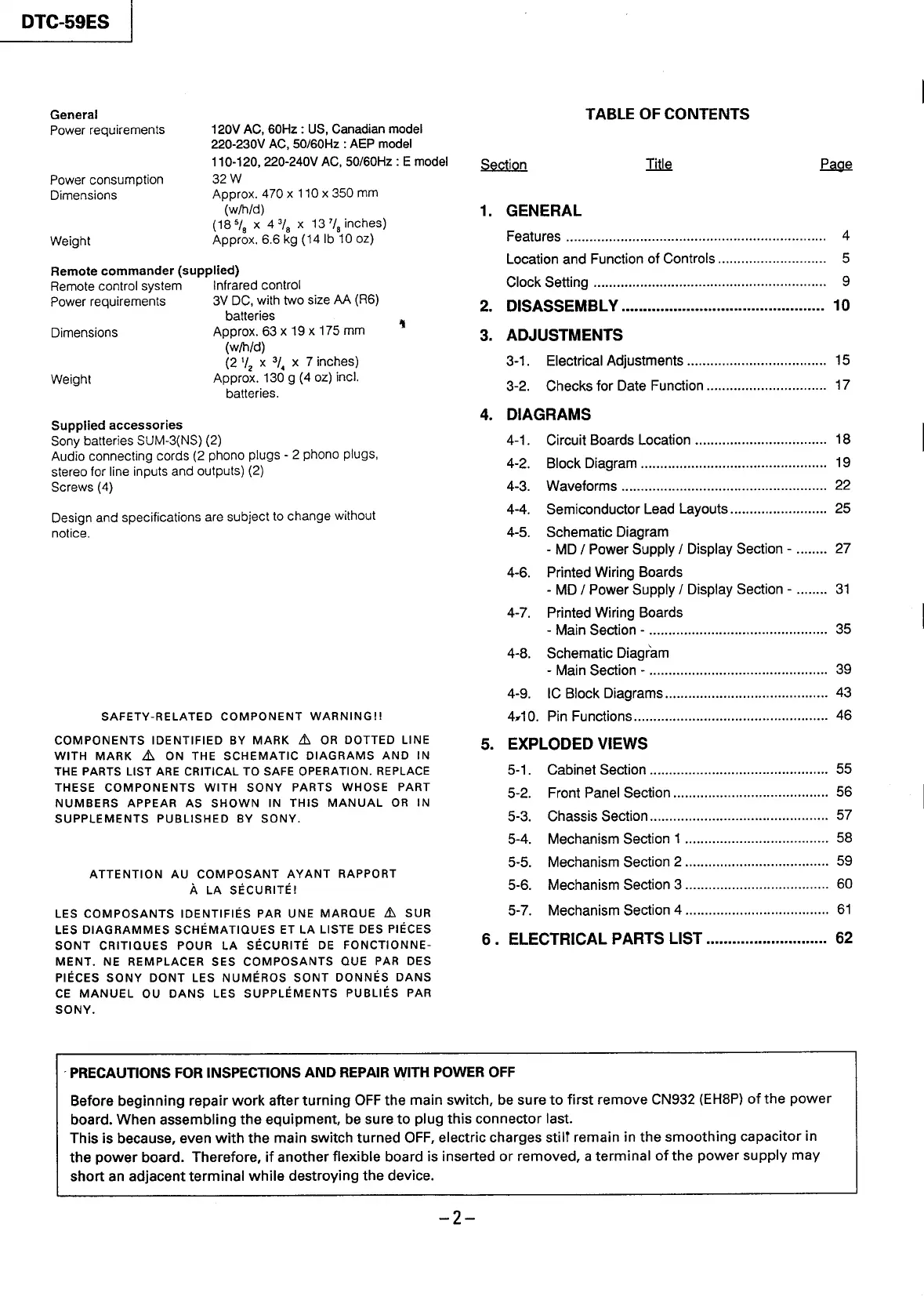 Sony DTC-59ES - Table of Contents; Supplied Accessories