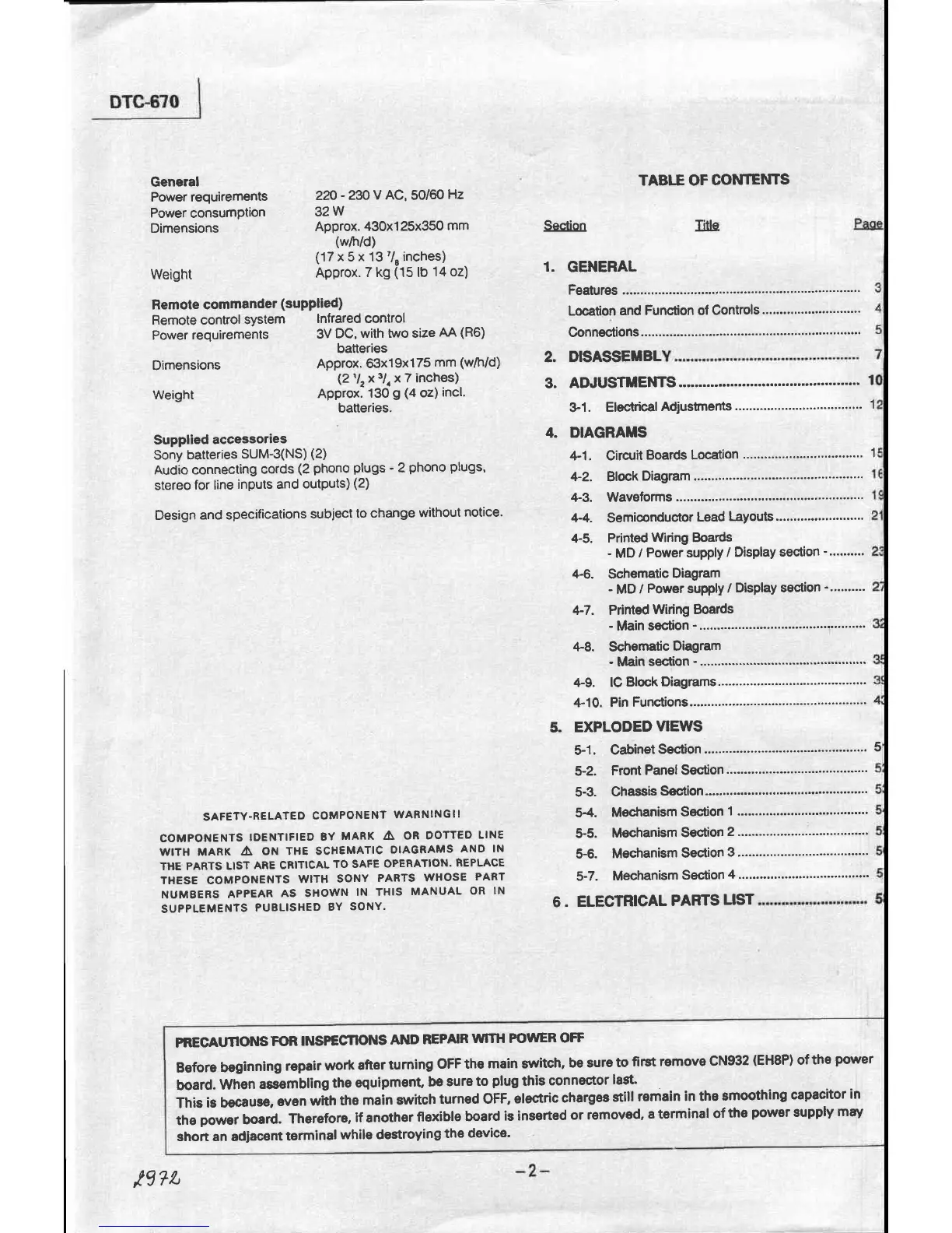 Sony DTC-670 - Safety and Precautions; Safety Related Component Warning; Power-Off Repair Precautions